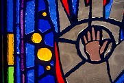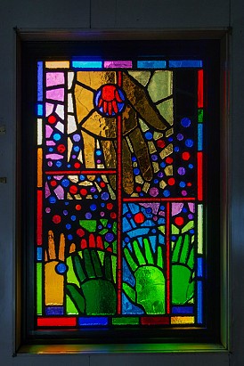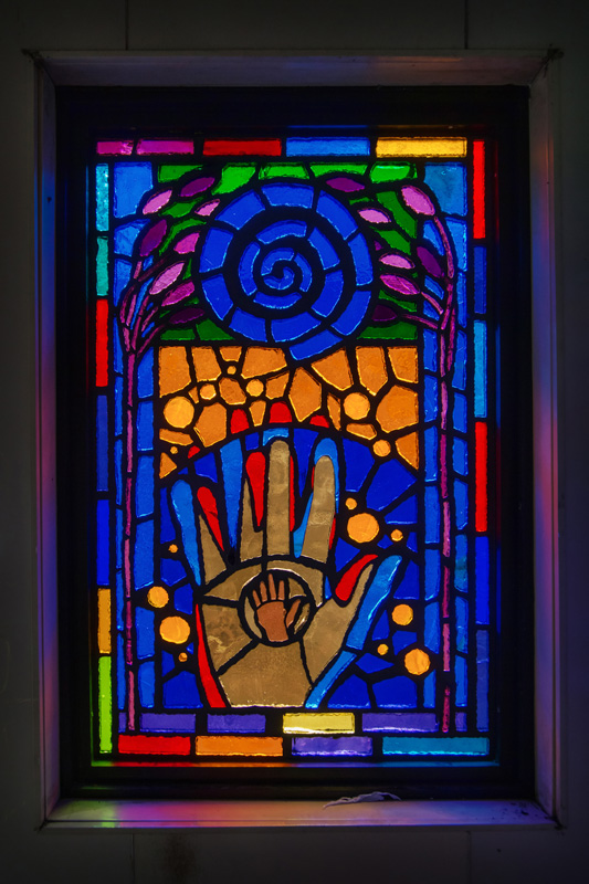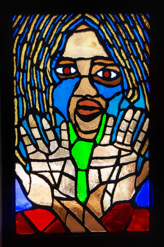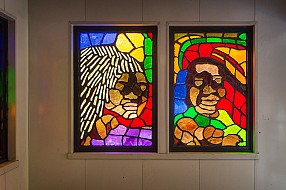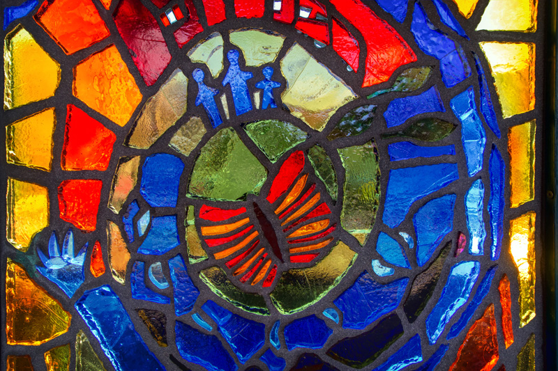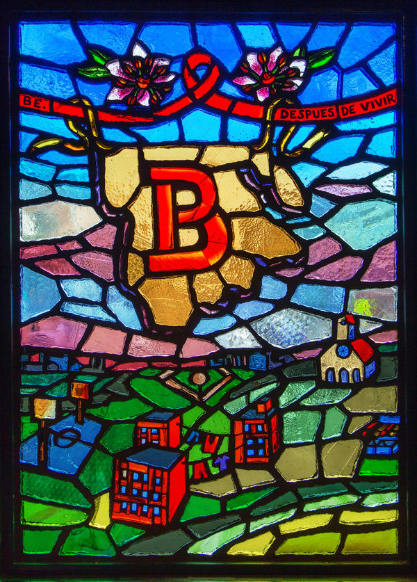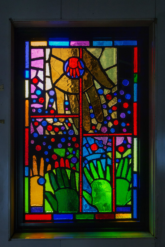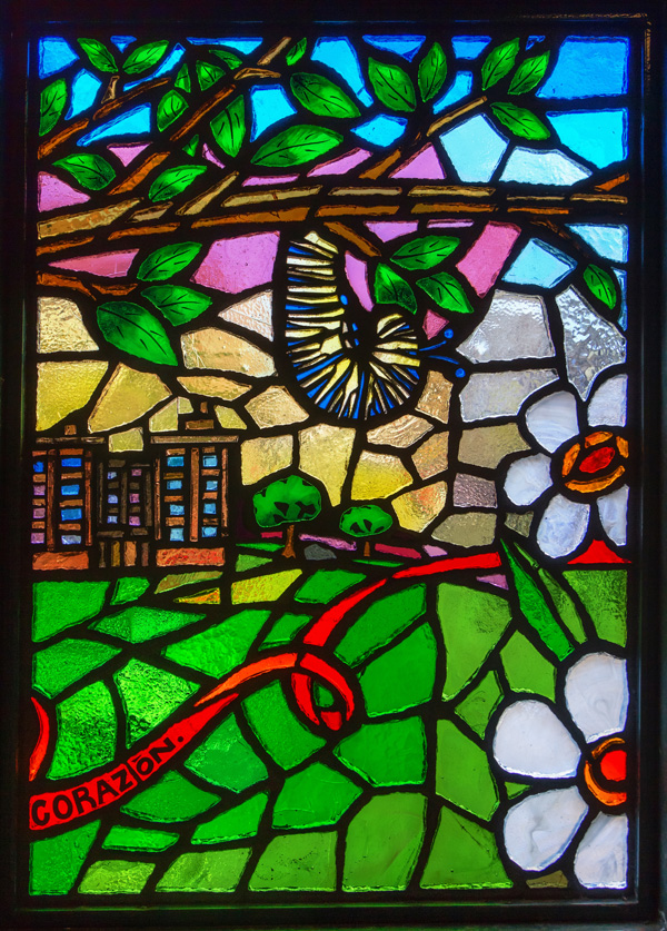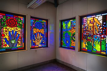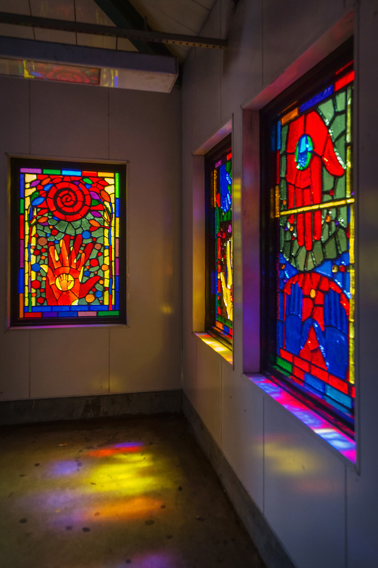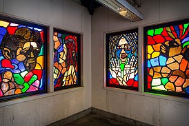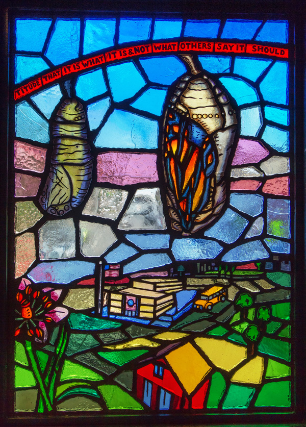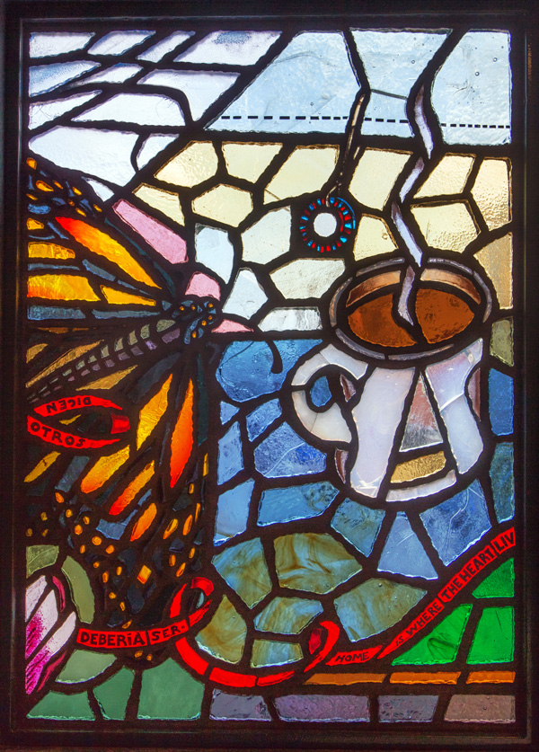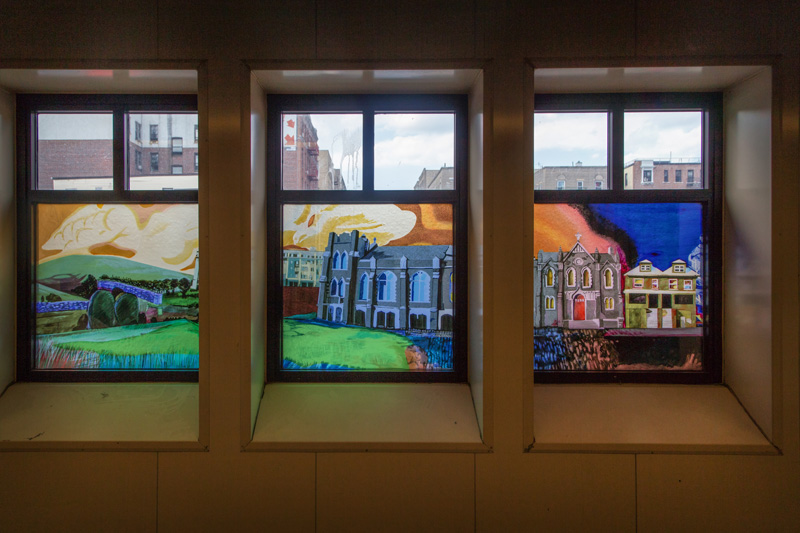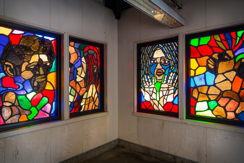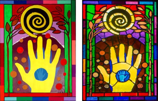 Translated from paper to faceted glass – at left, one of Sanchez’s original works, at right, the same art in glass installed at the station.