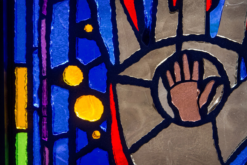 Originally designed with shaped bits of colored paper, Sanchez’s artwork features hands reaching out. Although the shapes are simple, they are easily recognizable, and add splashes of brilliant color to the platform and mezzanine areas of the station.