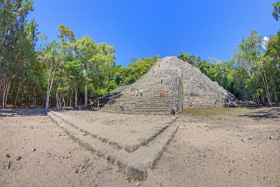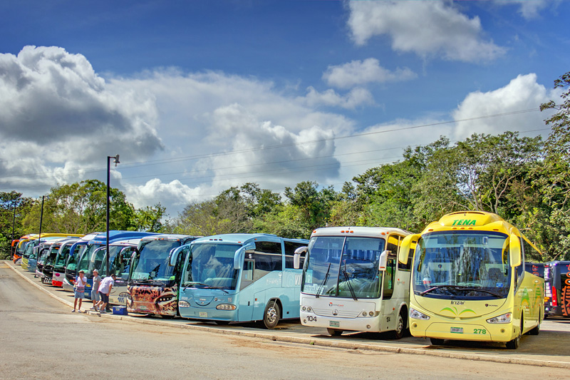 Top: The ruins at Cobá, generally considered “off the beaten track,” would be connected in the proposed Trans-Peninsular High-Speed Rail plan. Bottom Left: Chichén Itzá, perhaps Mexico’s most well-known ruins, would be on a special spur of the proposed rail line. Bottom right: Buses line up at the popular Chichén Itzá. Trains would add a new, potentially quicker, method of transport to the ruins.