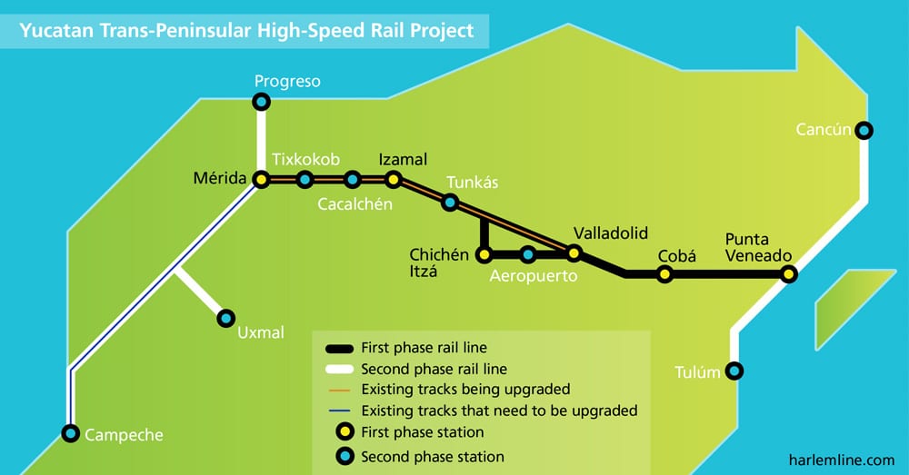 The Trans-Peninsular project plan consisted of two phases – the first called for new tracks to be constructed from Valladolid to Punta Veneado on the coast, which is about halfway in between Cancún and Tulum. Existing tracks from Mérida to Valladolid would also be upgraded to accommodate higher speeds. A small spur line connecting Chichén Itzá to the existing rail would also be added. In the second phase of the plan, a line would be constructed from Cancún to Tulum, connecting with the first phase at Punta Veneado, and the already existing tracks from Campeche to Mérida would be upgraded for high speed. Spurs to Uxmal and Progreso would also be added.