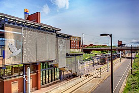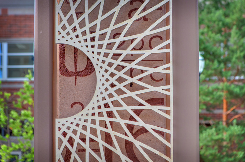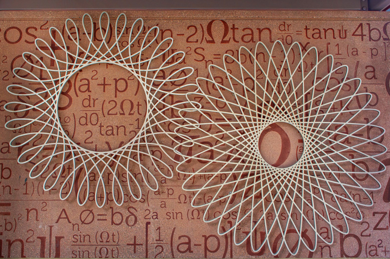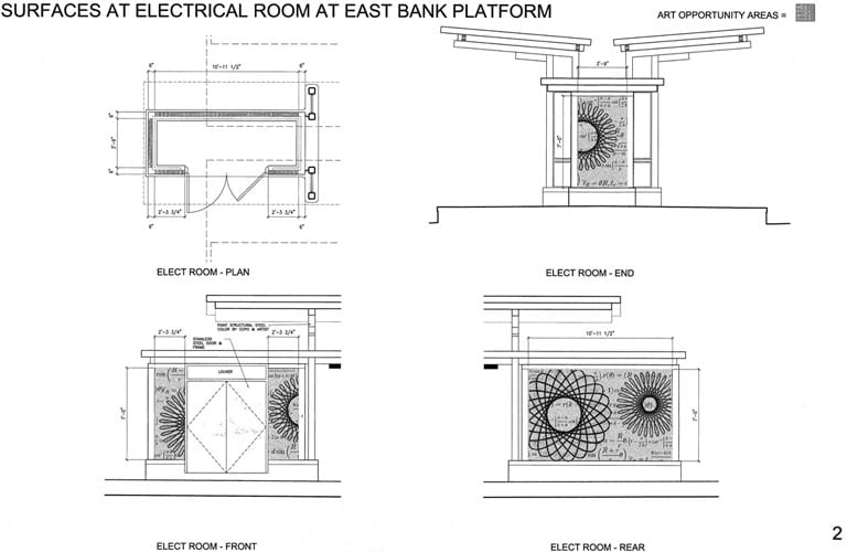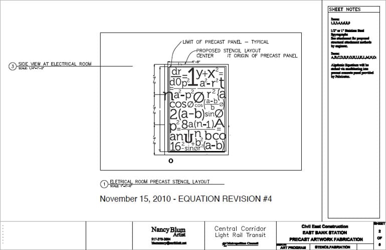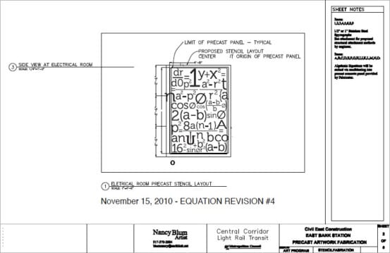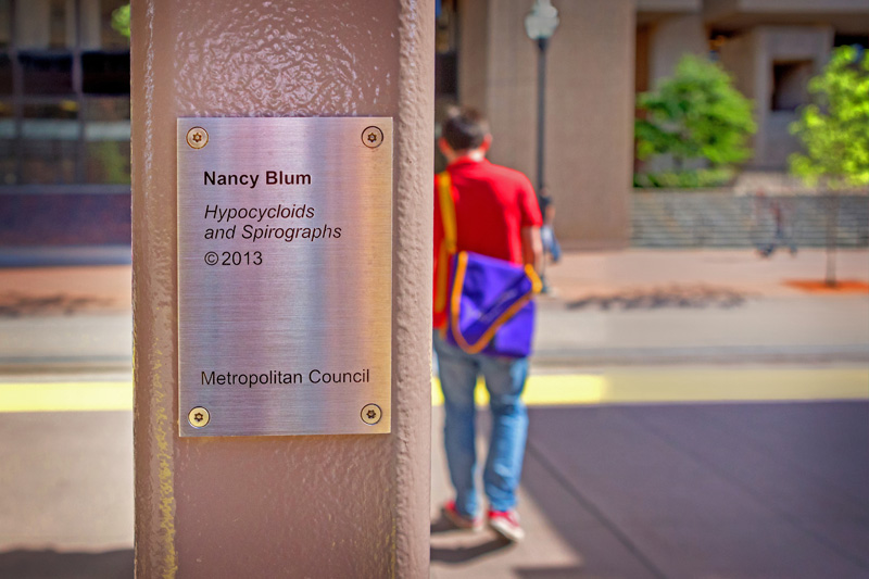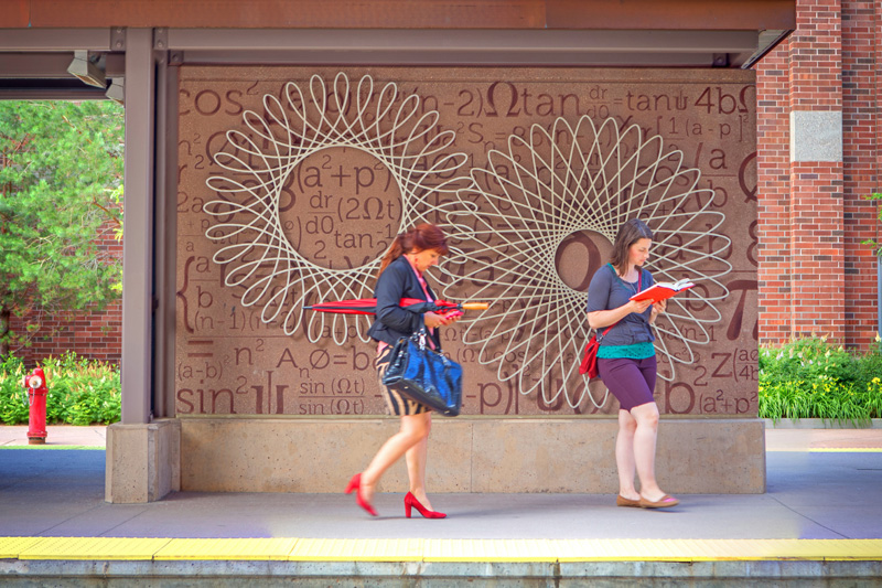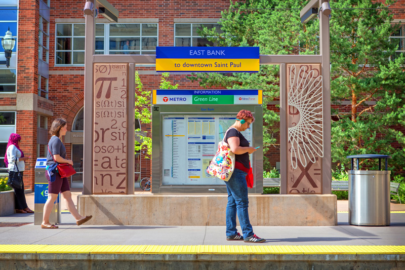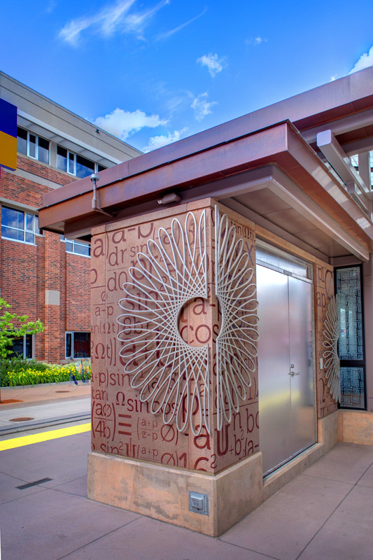 For the East Bank station, Blum’s art reflects mathematical formulas – referencing the station’s proximity to the University of Minnesota’s main campus. The formulas are sandblasted into concrete, and hypocycloids cut out of stainless steel mounted above. The effect is both interesting and attractive.