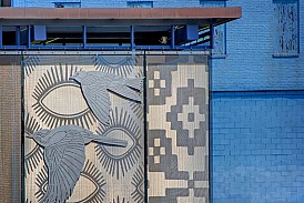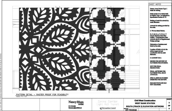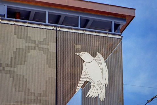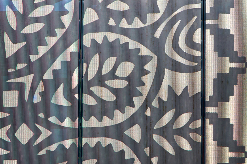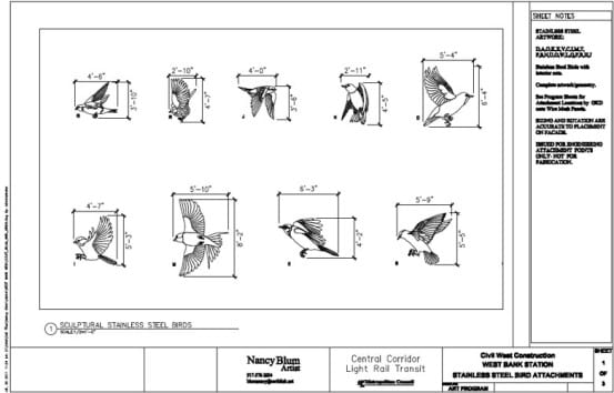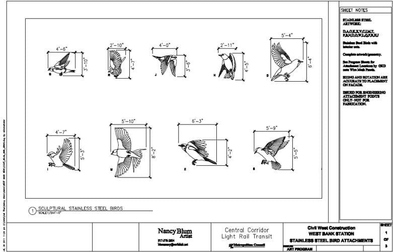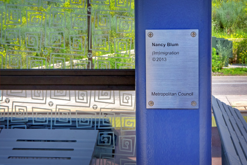 For her work in Minnesota, Blum designed work for the East Bank and West Bank stations, located on either side of the Mississippi River in Minneapolis. At West Bank you’ll find the work Immigration/Migration, which features birds fabricated out of stainless-steel, and wire mesh etched with patterns. The etched mesh is certainly my favorite, as it is extremely subtle. The patterns are just barely visible under normal light, but when direct sun rays hit the mesh, the pattern is extremely bright and really shines.