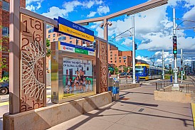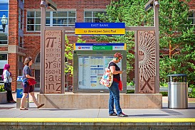 It has never been a secret that I am a lover of transit-based art. One of the reasons I enjoy the light rail in Minneapolis so much is due to the abundance of art. The system’s newest line, the Green Line, has two very cool stations that were designed by artist Nancy Blum (she actually did three, but the two I’ll feature today are arguably the nicest on the line). You may be familiar with Blum, as she’s been mentioned on this blog before. One of her previous public art installations can be found through the Arts for Transit program on our very own Hudson Line. The mosaics at Dobbs Ferry station are her creation.