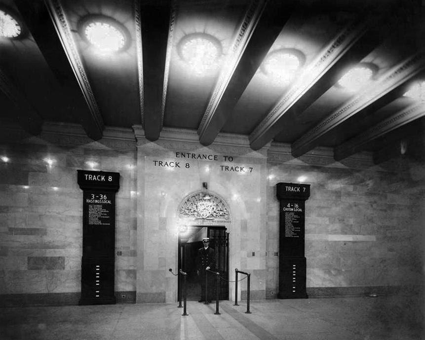 Early photo of Grand Central’s lower level, showing two departure banners, and the cabinets the banners were stored in when not being used.
