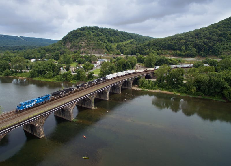 Another cloudy day as the Conrail heritage unit passes over the Rockville Bridge
