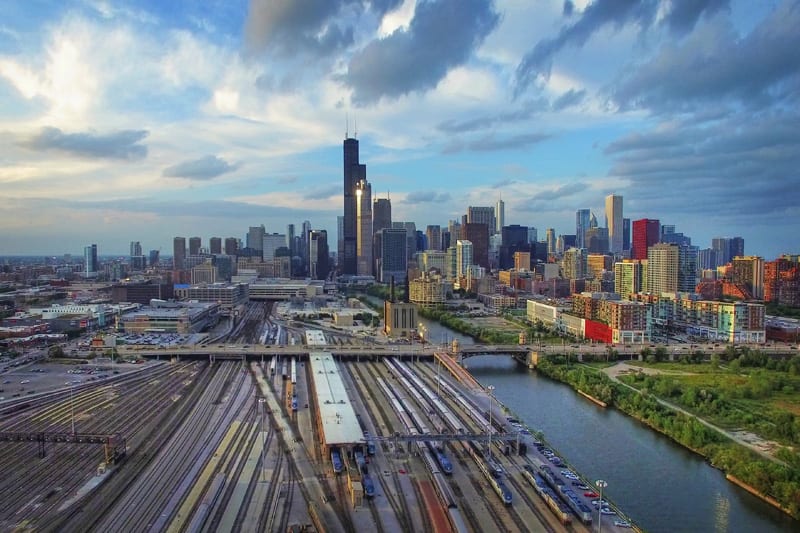 Flying over the yards in Chicago before sunset