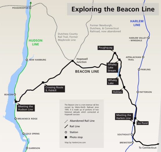 If you’re interested in seeing the Beacon Line in real life, there are several places where you can view it from public lands (which are locations shown here) – the Ice Pond Conservation Area, Holmes Road crossing in Holmes, Whaley Lake, Depot Hill Road crossing in Poughquag, Sarah Taylor Park in Fishkill, and Denning’s Point Park in Beacon, as well as the old station in Hopewell Junction (not pictured here).