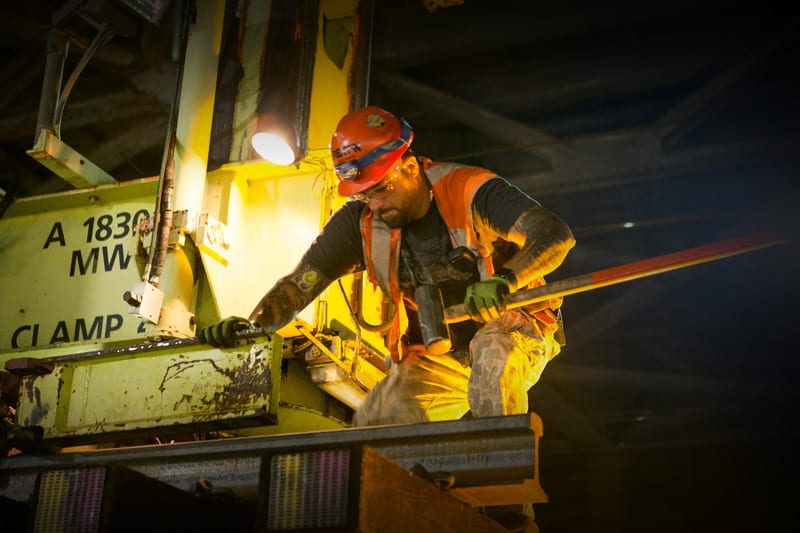 With the last Amtrak train in the house at 1:40 AM, there’s a brief lull until the first morning departure at 3:25 AM. It’s in this window that the switch is laid flat just beyond the mouth of the Hudson tunnels and loaded onto Amtrak’s Portal Krane-1, which will bring the heavy piece to the correct spot and lower it into position on the already prepared track bed. PK-1, as it is abbreviated, is a Transformers-looking beast, with movable legs that allow it to “walk” the switch into position. It’s controlled by a complicated looking panel mounted to the body of the operator – I can only think of it as a joystick on steroids, and idly wonder if the fellow is any good at video games.