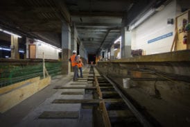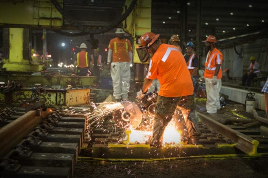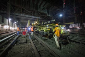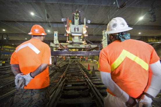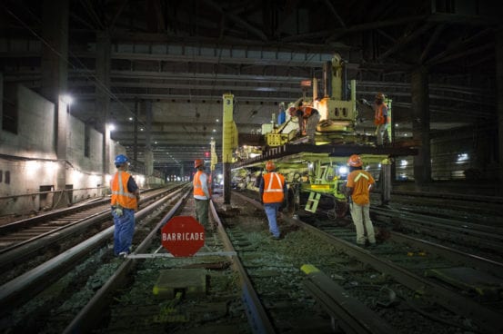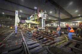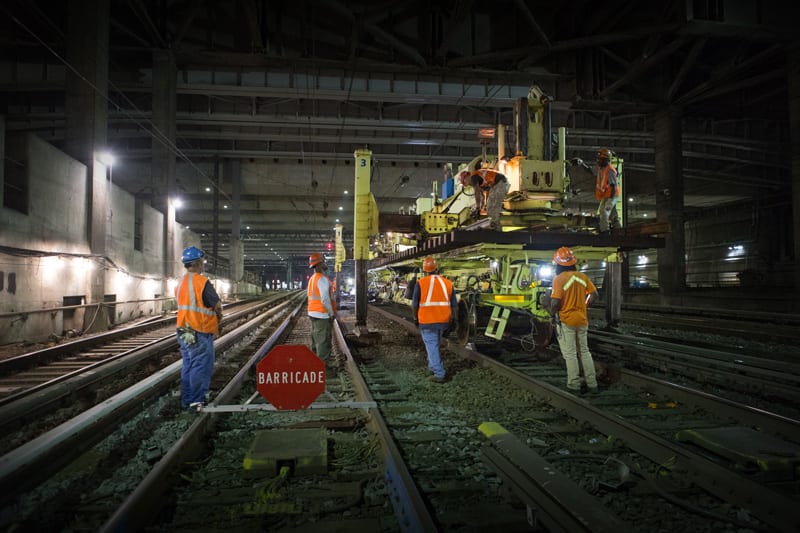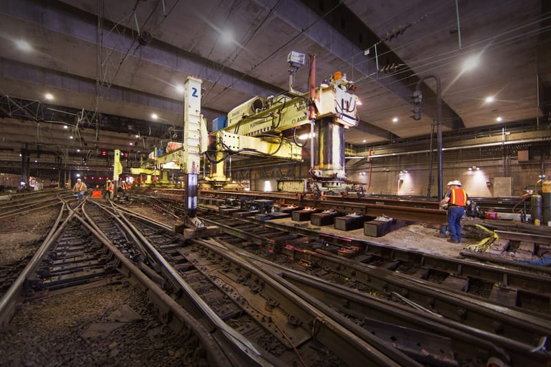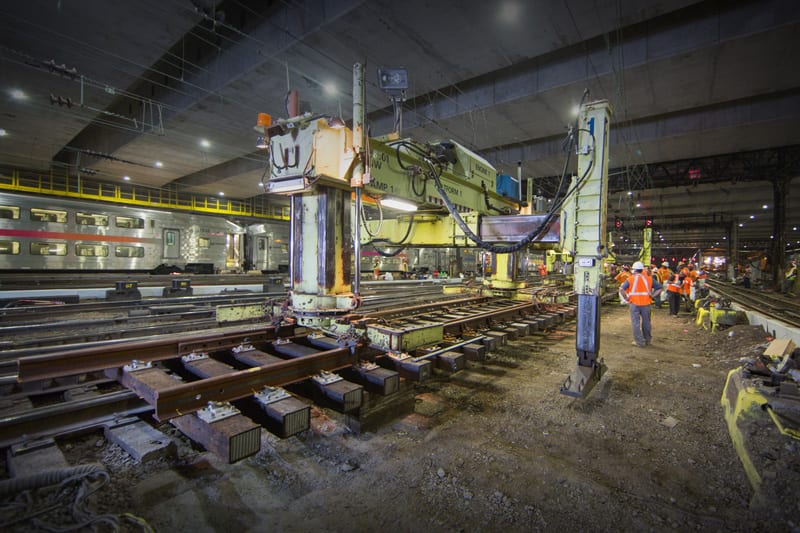 It may be hot, but down in the bowels of New York’s Pennsylvania Station it’s not really hell. Befitting the city’s well-known nickname, nobody here is sleeping at 2 AM – the renewal of Penn Station is a round-the-clock job. On the night of July 21st anticipation has been steadily building for the final placement of one of the many puzzle pieces of the station’s new track infrastructure. Switch 69B – everything is named numerically based on it’s position, with letters indicating the facing direction – is a massive piece of hardware that was assembled outside the station. In the cover of darkness it will be rolled in on its side, due to its width – when laid flat it is wide enough to foul the tracks on both sides.