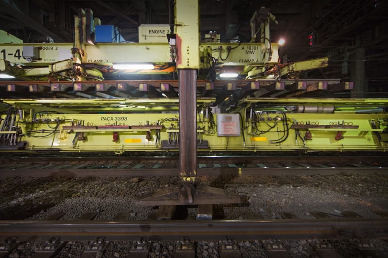 The night’s anticipation reaches its peak as PK-1, fully loaded, begins moving at 2:23 in the morning. When the vehicle reaches the right position next to the empty track bed, the operator controls PK-1’s legs to gradually shift the position of the switch. After several lateral shifting motions, the switch hovers in the appropriate spot just above the track bed. After trimming pieces of the already laid rail to accommodate it, the switch is finally lowered into position.