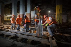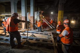Concurrently, another team is hard at work on the other side of the station’s tracks. Most of the infrastructure for Track 10, including rails and ties, third rail and catenary have all been removed for a complete rebuild. Here, too, anticipation mounts for the arrival of the cement truck for the night’s pour. Word comes on the radio that the truck is on the move, enroute to the Empire tunnels, complete with police escort. Of course, Amtrak’s cement truck is a hi-rail vehicle; before long it will slowly roll down adjacent to Track 10, ready to encase the already installed wood ties.