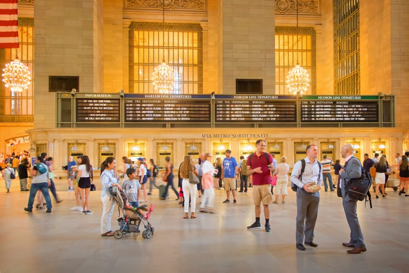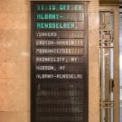 Crowds mingle around the departure board listing Amtrak in the Terminal