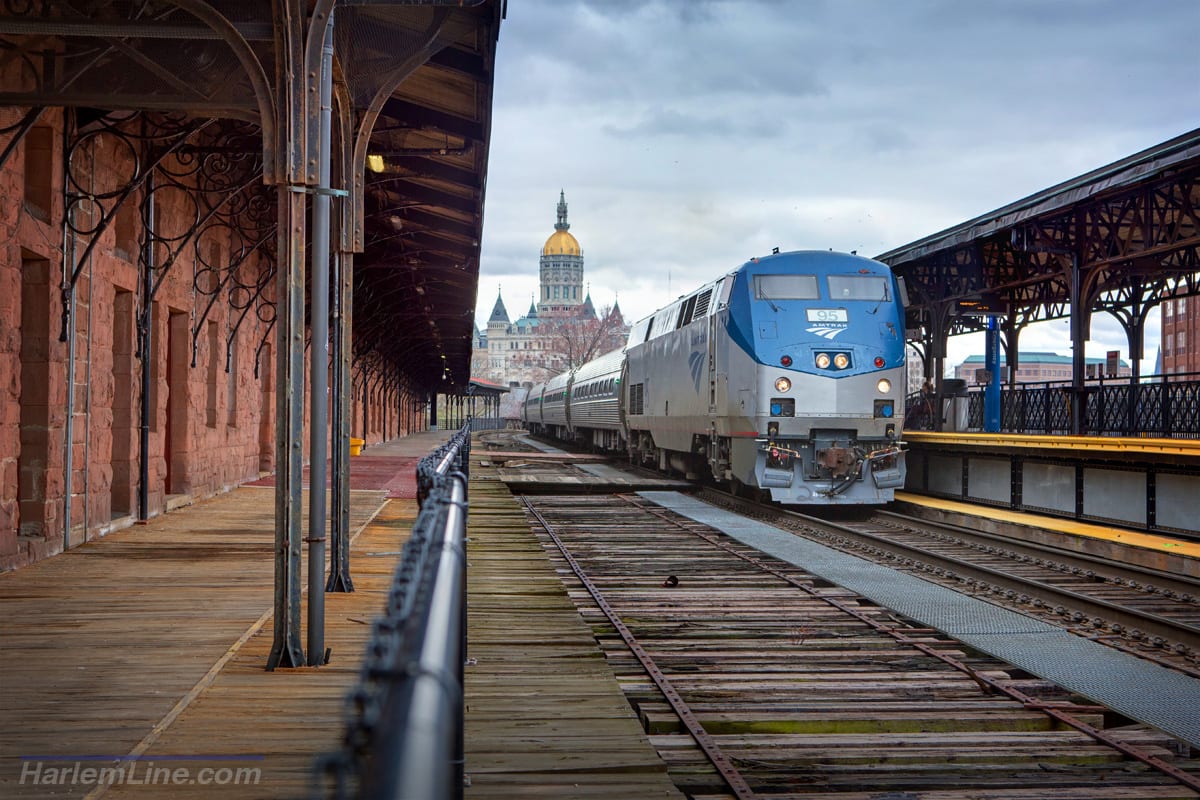 One of my favorite spots to catch Amtrak’s New Haven to Springfield line is this one at the historic Hartford Union Station. This shot from early April captures the Vermonter as it passes Connecticut’s capitol building and approaches the station.