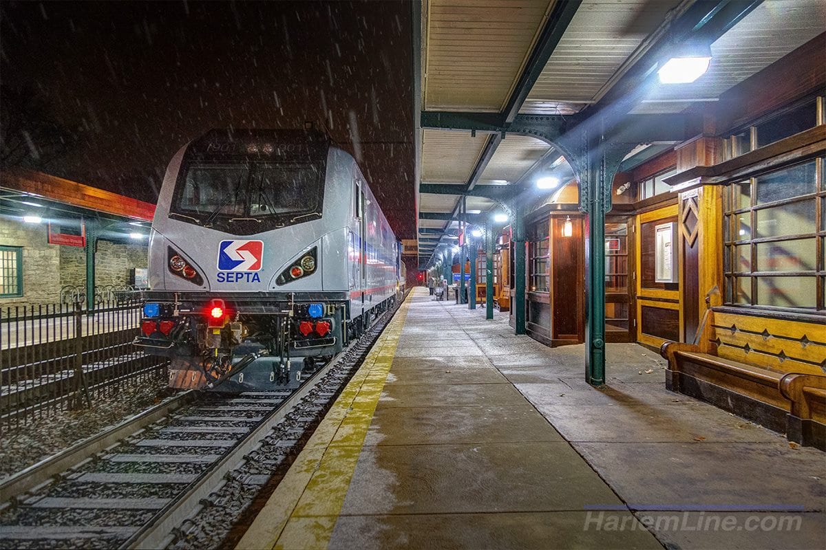 All the way from California, to arrive in the snow… Southeastern Pennsylvania Transportation Authority (SEPTA)’s first ACS-64 arrives in Philadelphia from the Siemens factory. Photo taken at the Jenkintown-Wyncote station.