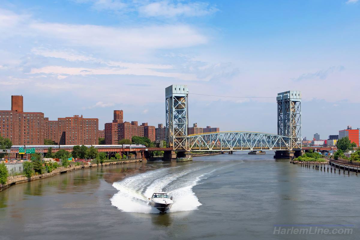 Shall we ride by train or by boat? Amtrak Empire Service train 233 has departed Grand Central and is enroute to Albany, captured while leaving Manhattan over the Harlem River Lift Bridge.