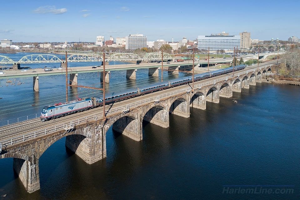 As the road bridge behind the rail bridge states, “Trenton makes, the world takes.” This drone view captured Amtrak’s Northeast Regional train number 125 as it departed Trenton for Philadelphia back in November.