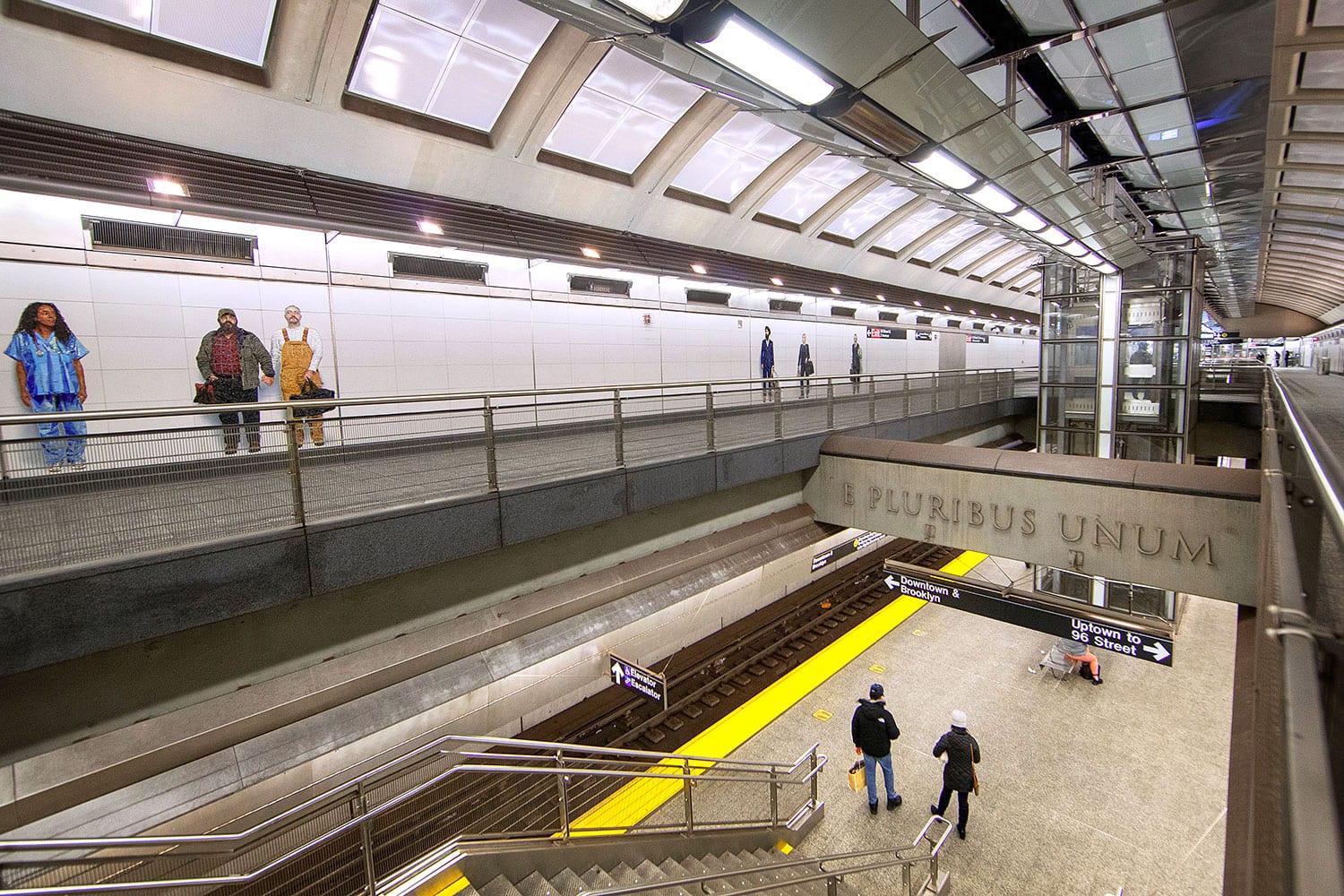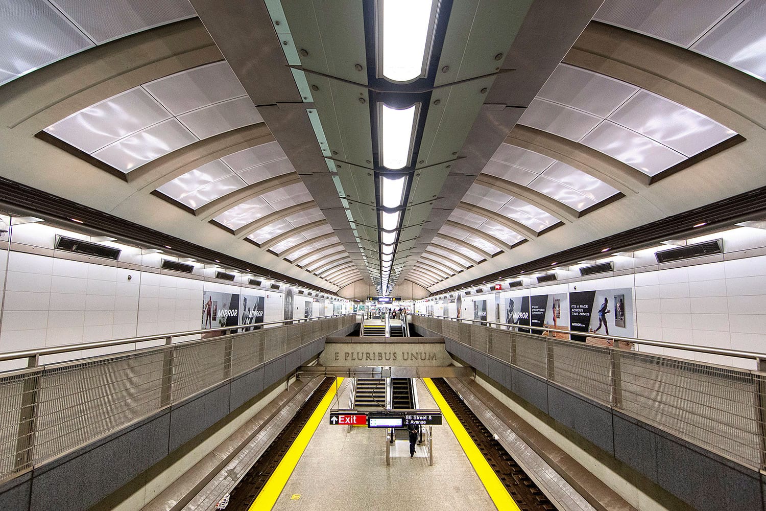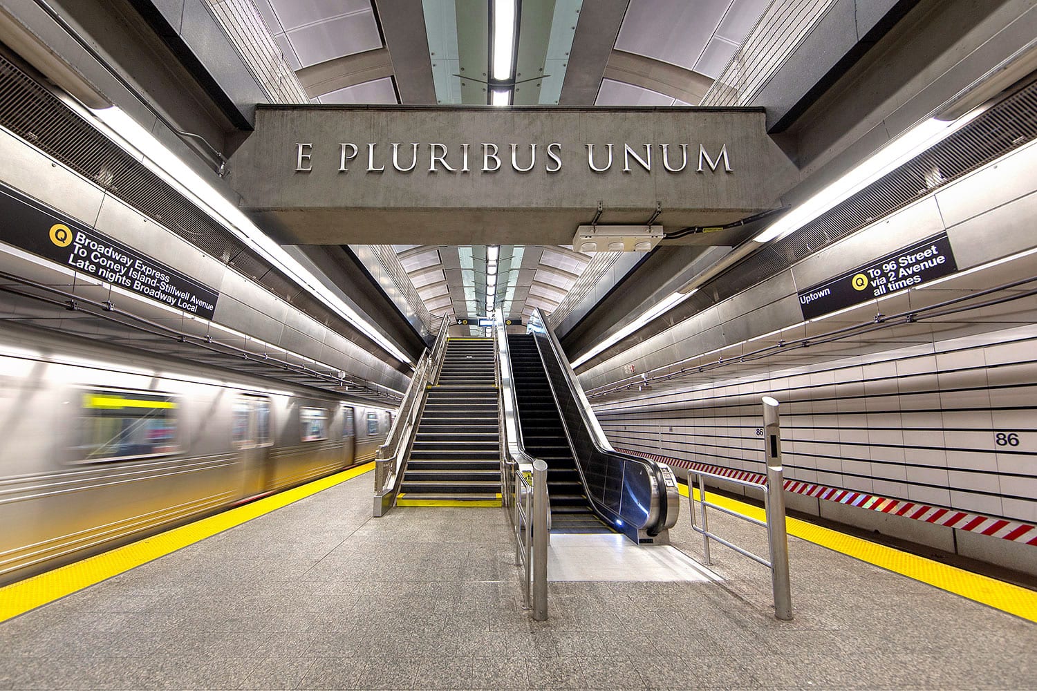 Collection of photos of the E Pluribus Unum message at the three new Second Avenue Subway stations. The phrase appears twice at each station.