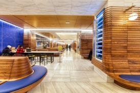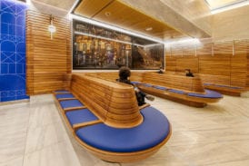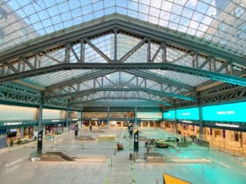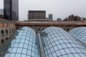Filling the east flank of the hall is a comfortable waiting room designed by Rockwell Group, with wood-wrapped walls, cushioned places to sit, tables for work, and ample charging outlets for the modern traveler. At the west, bright ticketing kiosks designed by SOM serve both Amtrak and Long Island Rail Road passengers. A light-filled Metropolitan Lounge designed by FX Collaborative, complete with upscale furnishings and alcove seating areas, boasts a balcony overlooking the expansive hall. Yet all of these fail to compare with the focal point of the redevelopment—a 92 foot high set of arched skylights, comprised of 3,384 insulating frit glass panels, held in place with 670 metric tons of structural steelwork and covering over 5,000 square meters of space. Fabricated and put in place by German company Seele Group, massive scaffolds needed to be erected skyward to facilitate their installation over a year ago. The Tennessee marble floor—Quaker Gray, installed by Miller Druck—provides a warm and elegant touch to the designed space. From that floor one can look skyward and marvel at the six foot by twelve analog clock designed by Pennoyer Architects, yet another nod to the original Penn Station, whose Roman numeraled clock likewise held a position of honor below the skylights. Although the inside of the building is certainly the highlight, the outside has also been given a restoration, with Boston Valley Terra Cotta replicating ornamental designs for the top of the building. After dark the building’s façade is now awash in a cycle of ever changing colored light. The entire redevelopment is itself a work of art, breathing new life into the stately former postal facility.