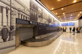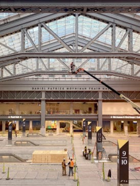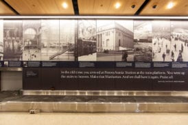 Enclosed within the station’s waiting room are Penn Station’s Half Century, photographs by Canadian visual artist Stan Douglas which recreate nine moments in time at the original Penn Station. Due to the Covid-19 pandemic Douglas individually photographed 400 people in period attire over four days of shooting, later layering the images together to form the crowds in each photo. Interiors of Penn Station were digitally recreated utilizing archival plans and photographs. Reimagined moments include two scenes of an impromptu Vaudeville performance while passengers were stranded in the station due to a snowstorm, soldiers saying their goodbyes before heading off to war, an airplane on display to promote Transcontinental Air Transport, wartime murals plastered across the walls, bandit Celia Cooney’s return to New York by police after spending 65 days on the lam, African American labor organizer Angelo Herndon’s arrival at the station after the Supreme Court decided in his favor, the futuristic Lester Tichy-designed “clamshell” ticket counter installed in 1956, and a scene from the film The Clock, where Judy Garland’s character trips over a soldier’s foot in Penn Station sparking a whirlwind romance—which now appears to take place in the real station, as opposed to a California sound stage.