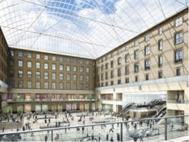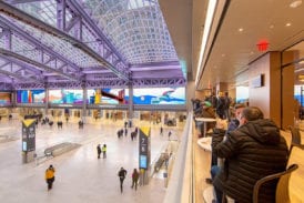 Despite setbacks during construction due to the pandemic, Governor Cuomo was determined to open Moynihan Train Hall on time. Although the hall and its expansive skylights are gorgeous, and you can actually step aboard a train here, it is not yet a world-class destination. Missing are the typical amenities that one would expect from a train station, including restaurants and shops. Walls have been erected to obscure active construction areas from the public. The is expected 120,000 square feet dedicated to retail and restaurants is still a work in progress. Atop the north balcony will be a signature restaurant with tables overlooking the hustle and bustle of the hall. A food hall designed by Elkus Manfredi architects will be located on the ground floor. Two more signature restaurants will round out the culinary selection, with one rendering showing a restaurant providing outdoor dining at the corner of 33rd and 9th Avenue.
