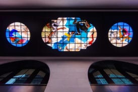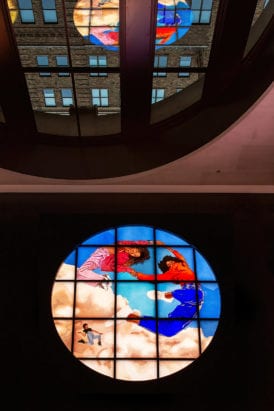 Kehinde Wiley, known for riffing off of and reimagining the works of old masters with black models, created the stained Czech glass triptych at the 33rd Street entrance entitled Go. The hand painted piece is backlit over the ceiling, featuring break dancers flying across a cloud-filled sky. The work is a modern reinterpretation of the classical frescoes that adorned the ceilings of notable buildings, a connection complete with a young woman’s outstretched hand, referencing Adam’s hand meeting God’s in Michelangelo’s masterpiece on the ceiling of the Sistine Chapel.