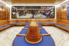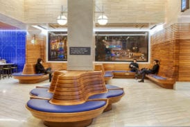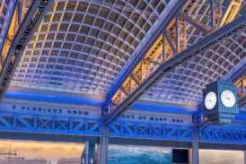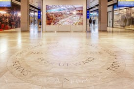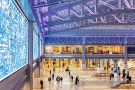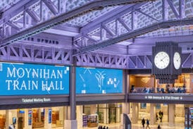 Hearkening back to Moynihan’s guiding concepts, the train hall is filled with art (although the man himself would likely have preferred the inclusion of more American artists). Three permanent installations are joined by a video loop of designs created by Moment Factory playing across the four display screens on the east wall below the skylight. Illustrated renditions of an array of New York state landmarks, including the Chrysler Building, Brooklyn Bridge, Apollo Theatre, Flatiron Building, Verrazzano Bridge, Dewey Arch, Coney Island Cyclone, Gantry Park, Bannerman Castle, Buffalo City Hall, the New York State Capitol, Letchworth State Park, and Montauk Point lighthouse, sail across the giant screens. Evoking the Kodak Colorama that was a mainstay for years at Grand Central—with static imagery changed every three weeks—the Moynihan screens provide a modern take on a canvas of ever-changing art.
