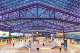 Despite the plentiful ideas across decades, designers often come full circle. SOM’s final design, which was built as part of Phase II, bears striking similarities to their first, notably in revealing and reusing the building’s structural steel trusses. The glass skylights remain, but take on a more fluidic and arching shape, and the floor below the skylights remains open for movement without additional glass mounted in the floor, or waiting pens segmenting the space. With Phase II’s commencement, the station long ago imagined by Moynihan was finally coming to life—and in a final nod to his tireless efforts, the train hall would named in his honor.