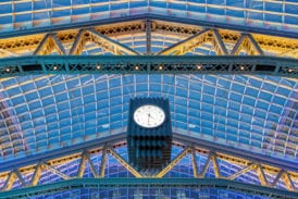 Moynihan Train Hall is open daily from 5 AM to 1 AM, off hours travelers will have to use dreary Penn Station. Visit at different times to fully appreciate the light aspect of the design—recommended times are midmorning on a sunny day to catch the rays through the skylights, or after dark when the space is illuminated by color changing LEDs.