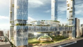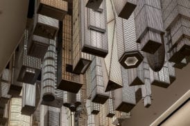 Berlin-based artists Michael Elmgreen and Ingar Dragset created The Hive, a diverse city of aluminum skyscrapers, both replica and invented, hanging from the ceiling at the 31st Street entrance. A mirrored base allows viewers to interact with, and become a part of the artwork, despite its location high overhead. The piece weighs more than 30,000 pounds, utilizes 72,000 LED lights, and has six buildings able to change color.