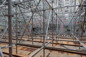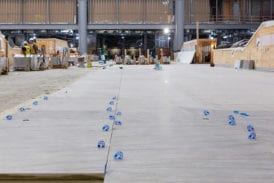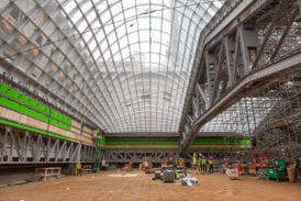 Views of the construction of Phase II, including the scaffolding used to install the glass skylights, the crew installing the marble flooring, and the preparation to hang the clock at the center of the hall.
