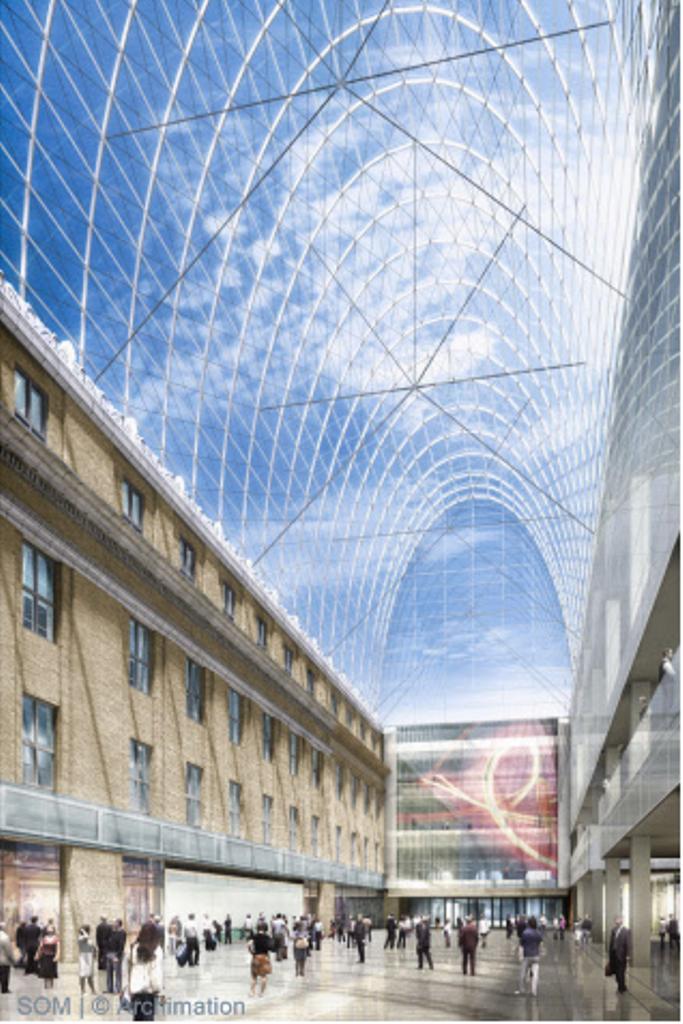 The decades-long battle to build a replacement for Penn Station can only be described as complicated—from who would be participating and where the money would come from, all the way down to what it would look like. Various design concepts had been proposed over the years, some with larger price tags than others. Hellmuth, Obata & Kassabaum had proposed a 120-foot parabolic glass arch over Farley’s hall in 1993, imitating the train sheds of Europe. Skidmore, Owings & Merrill released other early concepts in 1999, uncovering the original structural trusses of the building to support a glass ceiling. A second set of glass panes built into the floor would allow natural light to penetrate down to track level. Above it would be a large video board showing video feeds of arriving trains, train schedules, the weather, and even stock tickers. Covering the other half of the hall underneath the glass ceiling would be several waiting pens with hard-backed seats for departures on each track. Although many liked elements of the designs, there were worries that the glass ceilings would be an extravagant expense, which the in-floor glass would only increase, along with limiting mobility through the hall.