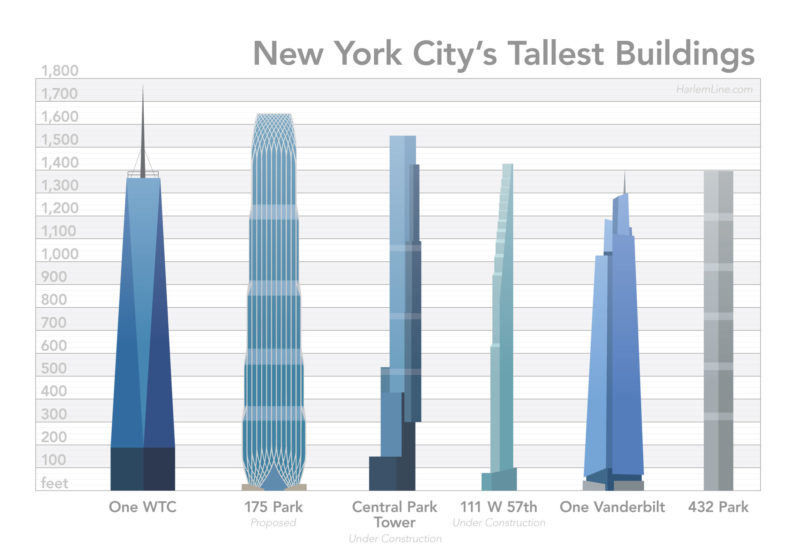 At completion, 175 Park will be the tallest building in New York City by roof height. Since the Council on Tall Buildings and Urban Habitat (yes, it’s a real thing) judges building height to the architectural top of a structure, which includes spires, One World Trade Center’s 408-foot spire still makes the 1,368 foot tall building come out on top with a total 1,776 feet. Nonetheless, staying in the penthouse of the 1,646 foot tall 175 Park, with its higher roof, will make you feel like you’re at the top of the heap.