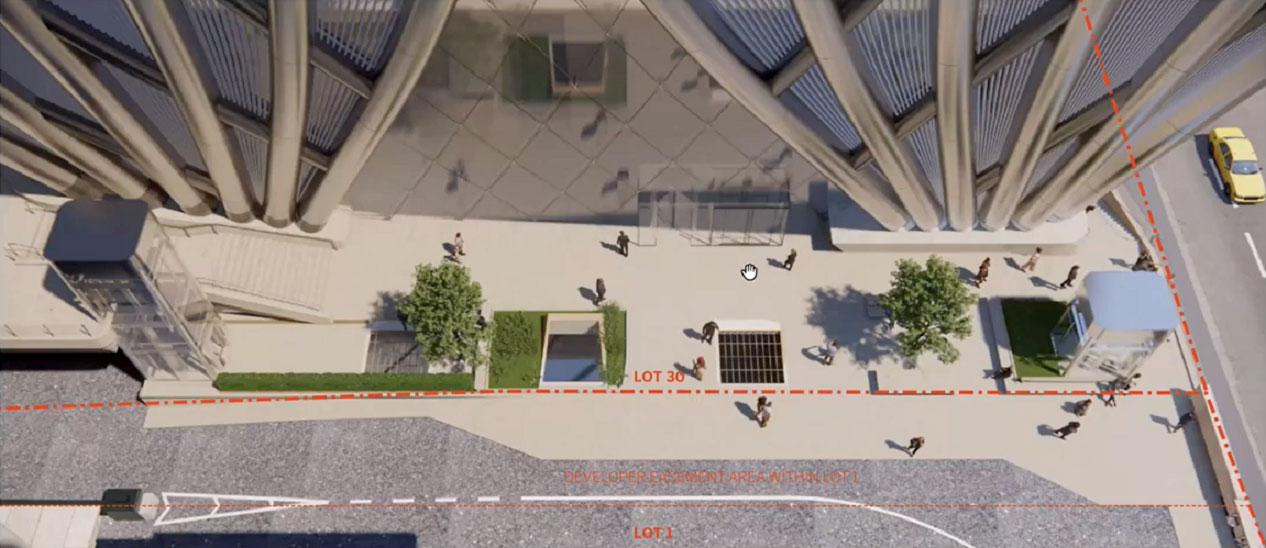 The two front metallic column bundles tie into a column base, which is subsequently anchored to a below-grade mega column. Their column bases will be obscured from view by flanking ramps, leading to one of my favorite parts of the new development…