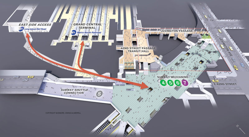 Much has changed since that time, and Grand Central will become more complex than its creators ever envisioned with the addition of East Side Access. This extension of purpose needs to fit intuitively into the already intricate arrangement, and travelling up from the ESA hall, up from GCT’s lower level, up again and across to the subway, then down to get through fare control, and down again to board your train is an incredibly convoluted journey for anyone arriving on an LIRR train looking to transfer to the subway. There is, however, a more harmonious solution.