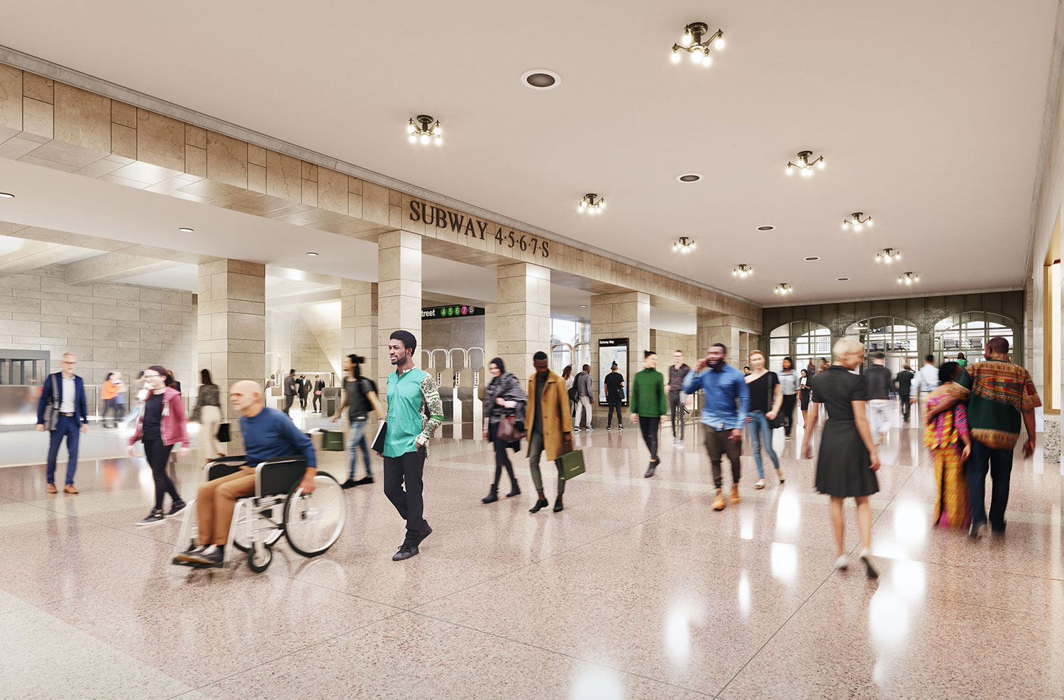 Gallery not found.One of the most notable transit improvements to be completed as part of Project Commodore is the creation of an open train hall for access to the subway. The other part of being harmonious with Grand Central is the new structure working in tandem with the landmark, and these enhancements were welcomed by the Landmarks Preservation Commission for improving the current state of affairs (or as Commissioner Devonshire called it, “hell on Earth”). That current state of affairs is a very congested 42nd Street passage, filled with people moving about in a multitude of directions—some going in and out for the subway, and others going in and out for Metro-North or other spots in Grand Central. Further choking the space was the removal of one of the original entrance portals on 42nd Street in favor of an elevator, which will now be restored to its original configuration to allow freer movement, and the elevator relocated.