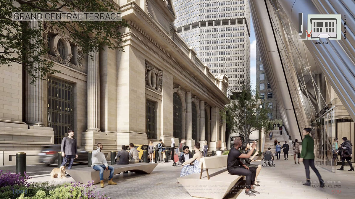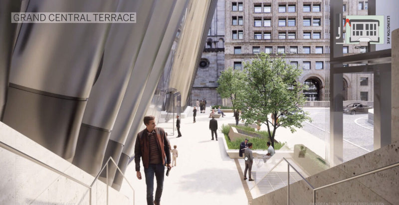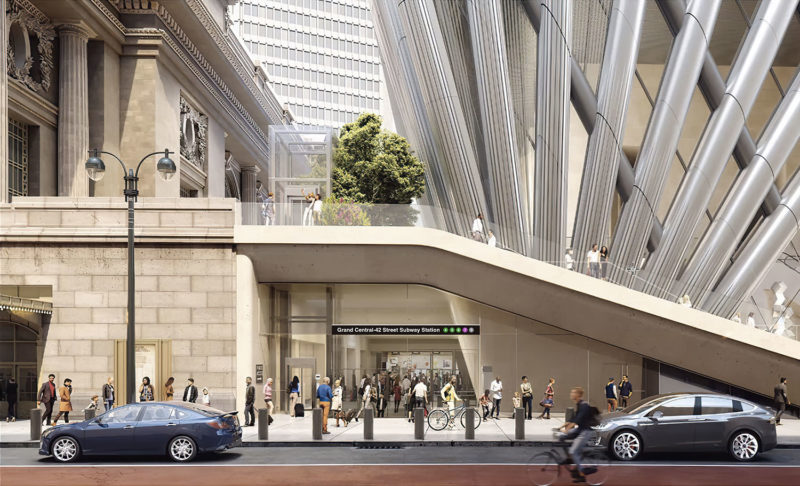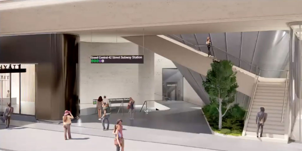 Though the enhanced visuals will certainly be appreciated by anyone walking through the neighborhood, the project also includes tangible improvements to make the lives of pedestrians better. The clunky overhang of the Grand Hyatt’s bar will be removed, no longer looming over the sidewalk on 42nd Street. The sidewalk in front of the building will be widened, and a new entrance will be provided for direct access to the subway to ease congestion. Two sloping walkways flank the entrance to the new skyscraper, providing pedestrian access to the viaduct level and the terraces, but will not take up any portion of the current space on the sidewalk.