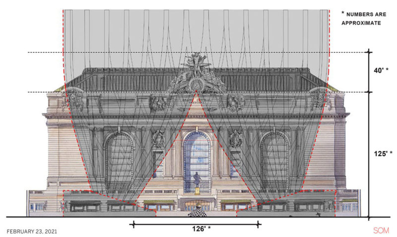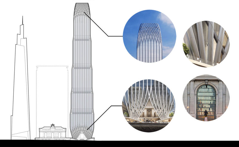 In contrast, the team at Skidmore, Owings & Merrill (SOM), the designers of 175 Park, have thought a lot about how their structure will look next to Grand Central, and have taken inspiration from it’s design. Notably, the project team also includes Beyer Blinder Belle—the firm that worked on the restoration of Grand Central in the 90s—as an architectural and historical consultant. Any supertall skyscraper would inevitably draw the eye, but the underlying concept of this project is to be respectful of, and to complement, not compete, with Grand Central, building on the legacy of “Terminal City.” Though thoroughly modern in style, and intentionally so, SOM’s proposed design boldly addresses the constraints of the location (there are limitations on where the building can be anchored, due to the railroad infrastructure below), yet is also sympathetic to its famous neighbor in several ways.