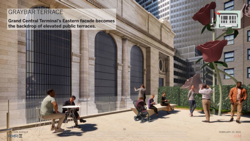 Three terraces will surround the west, east, and north sides of the building, two sloping ramps will provide access to the terraces from the south side, and another set of stairs will enable further access on the east. The Chrysler Terrace, on the east side facing Lexington Avenue, will provide a brand new way to appreciate the art deco Chrysler Building. Sandwiched in between the new building and the Graybar is the aptly named Graybar Terrace, behind the skyscraper. The most notable of the three, providing a unique new vantage point to take in the Terminal, is the Grand Central Terrace on the building’s west side. Filled with greenery, art, and places to gather, each of the terraces will undoubtedly be a popular addition to the neighborhood—especially the Grand Central Terrace which now reveals the usually unseen east face of the Terminal. Combined, the three terraces will provide 20,000 square feet of public space for the community.