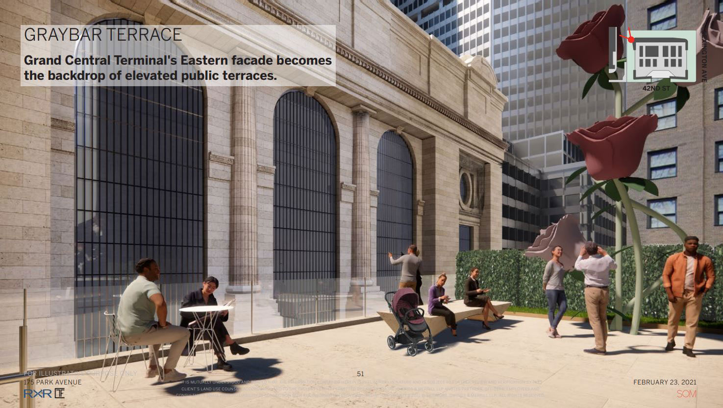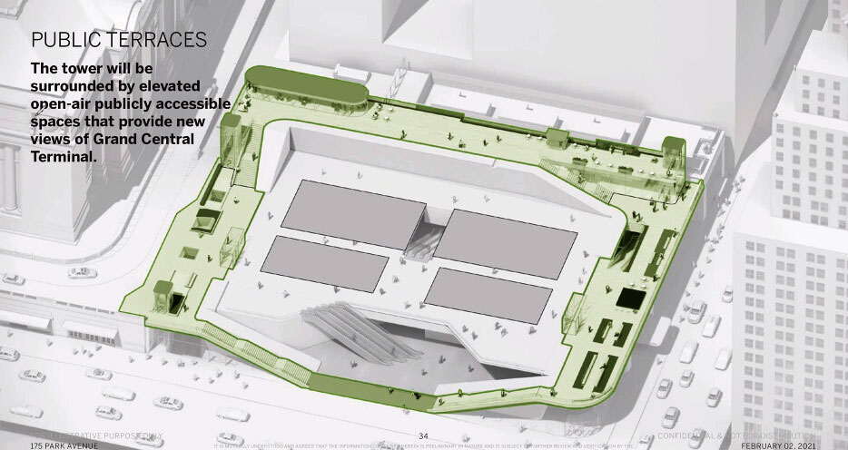 Further continuing the theme of respect for Grand Central, the design of 175 Park allows the Terminal to finally stand on its own again. The exterior wall of the Commodore and Grand Hyatt rose straight up at the property line, crowding Grand Central. Pulling the footprint of the skyscraper back from the property line and tapering the base of the building allows the Terminal to breathe again, as well as introduces free space to be offered to the public. Appearing to be an extension of the plinth which holds up Grand Central and Park Avenue around it, the terraces also provide visual continuity along 42nd Street and further wrapping around Lexington Avenue.