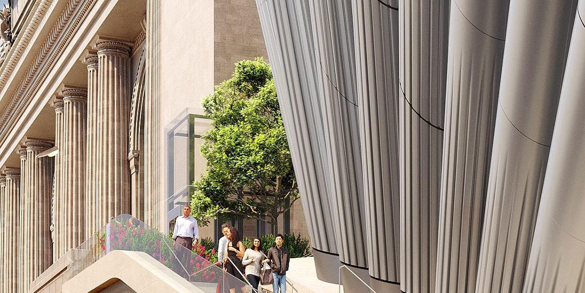 Although metal will be used as a visible material in the new structure, it will sport a warm matte finish to more closely imitate the Terminal’s Indiana limestone façade, and prevent garish reflections. The contemporary look is fluid, more resembling woven fabric than a boxy collection of geometric shapes. A metallic lattice structure wraps the building, tapering and intertwining at the top to form an elegant crown, and separating at the base like a curtain to reveal the entrance. The design is symmetrical, mirroring Grand Central’s balance, and texturally riffs off of the Terminal’s Corinthian columns and mullion windows. The sculptural base of 175 Park matches the scale and proportion of Grand Central’s façade, and the interwoven mesh skin running the length of the building divides into two load bearing bundles to anchor the structure to the ground in front. At ground level the individual metallic strands of the bundle are fluted, suggesting Grand Central’s classical columns, yet remaining more slender than the originals as to to not overshadow their monumentality.