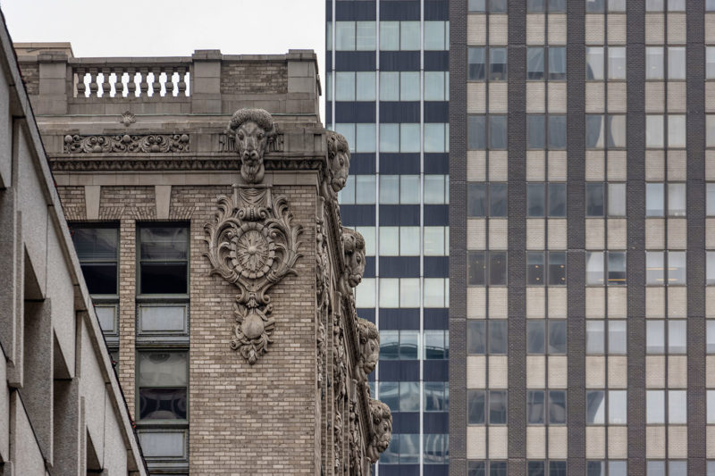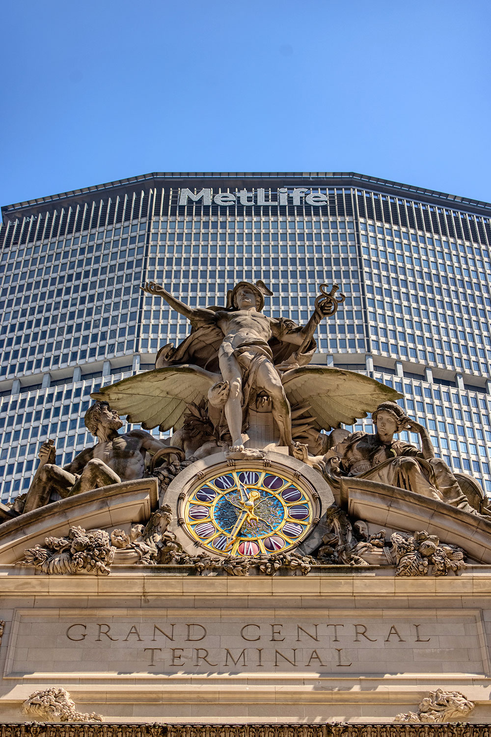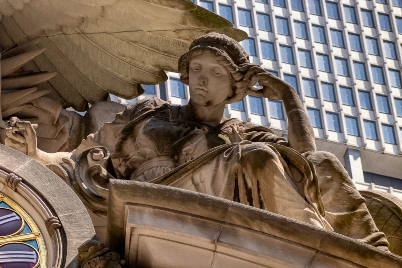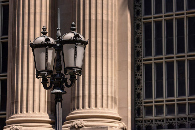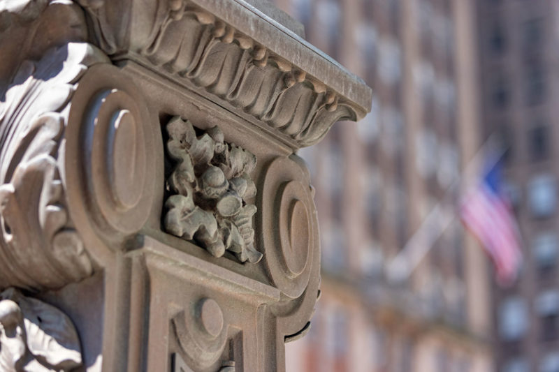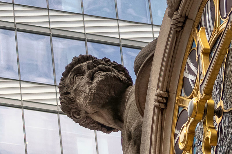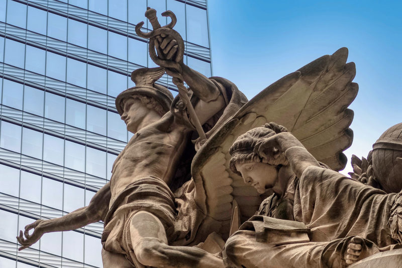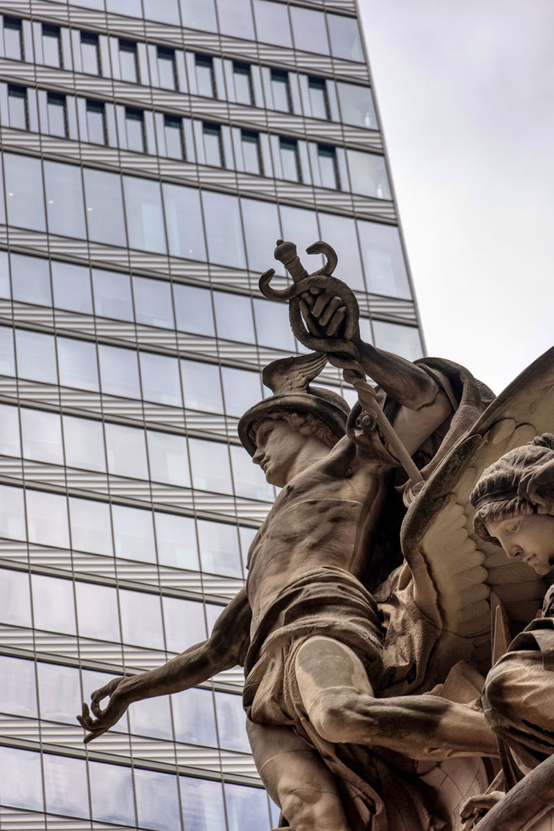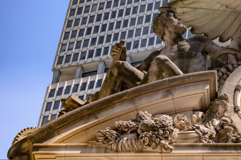 Below you’ll find a collection of my favorite images from that day, including glimpses of the new One Vanderbilt, and reflections of Grand Central across the now-closed Grand Hyatt, which won’t be visible for much longer. The photos also revive a long-talked-about point among mythology-lovers regarding Grand Central and who exactly appears upon the façade. Though architect Whitney Warren specifically identified the sculptural trio as Mercury, Hercules, and Minerva, the gear, hammer, and anvil symbols are more commonly associated with the Roman god Vulcan (or Hephaestus of Greek mythology). Hercules certainly seems like the more glamorous of the two, fitting in perfectly with the “Vanderbilt aesthetic,” yet Vulcan, god of metalwork, seems appropriate for a mighty railroad building links of iron and steel that connected the ever-growing United States. You’ll also find that another significant portion of the Vanderbilt aesthetic—the acorn and oak leaf motif—extends to the exterior of the station, including the streetlamps.