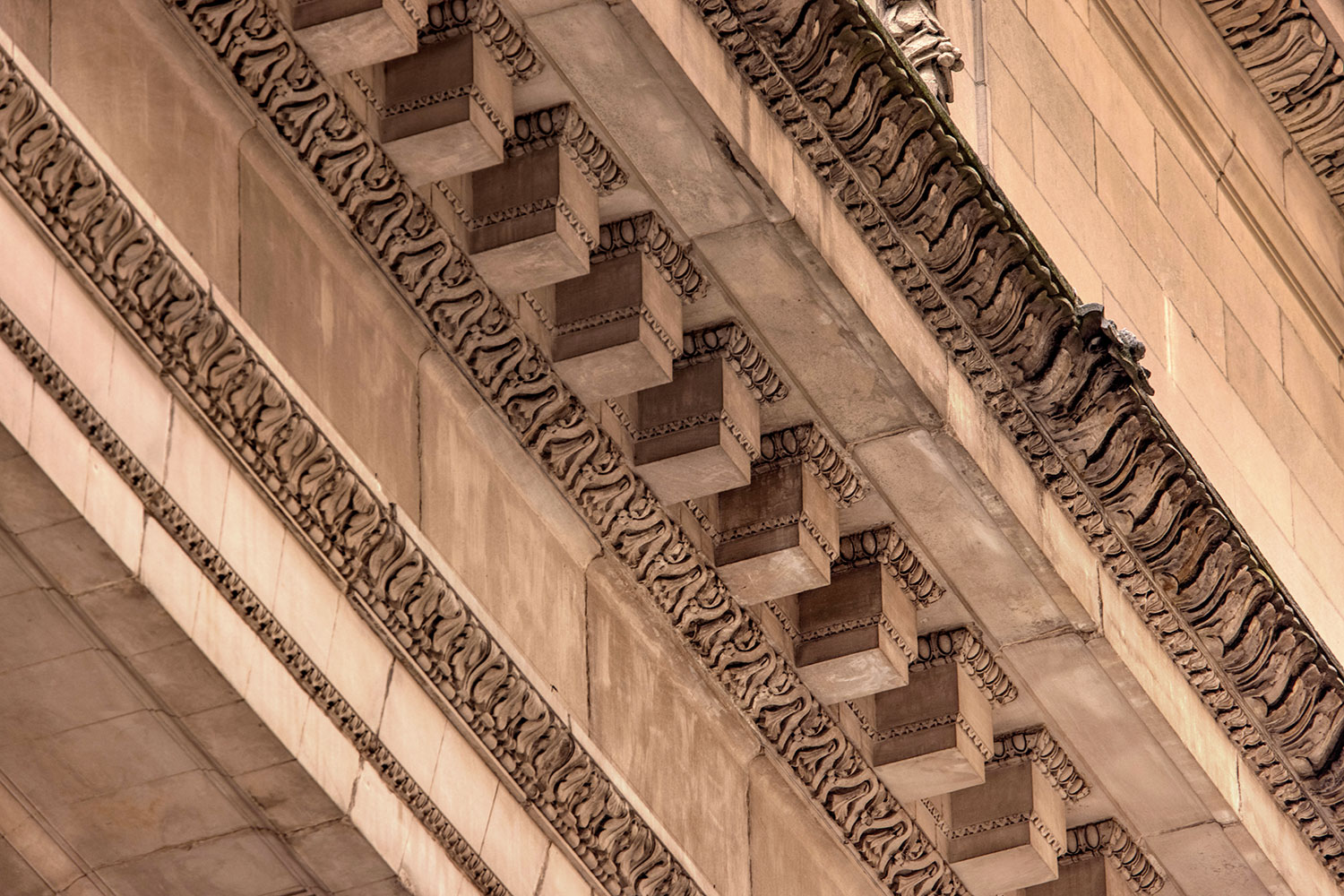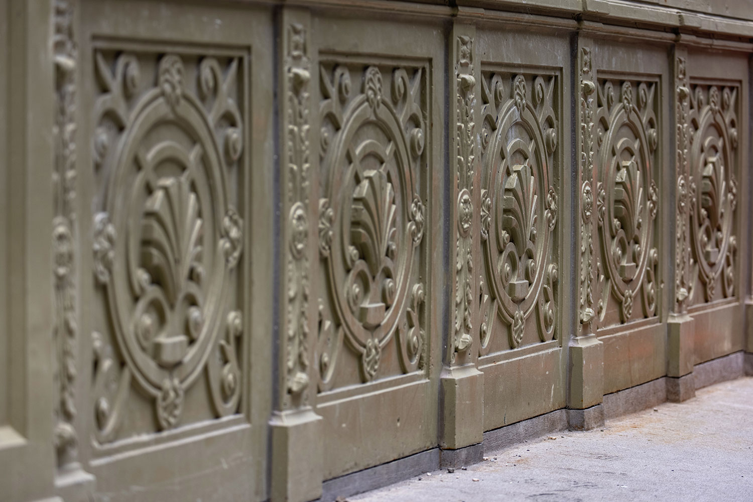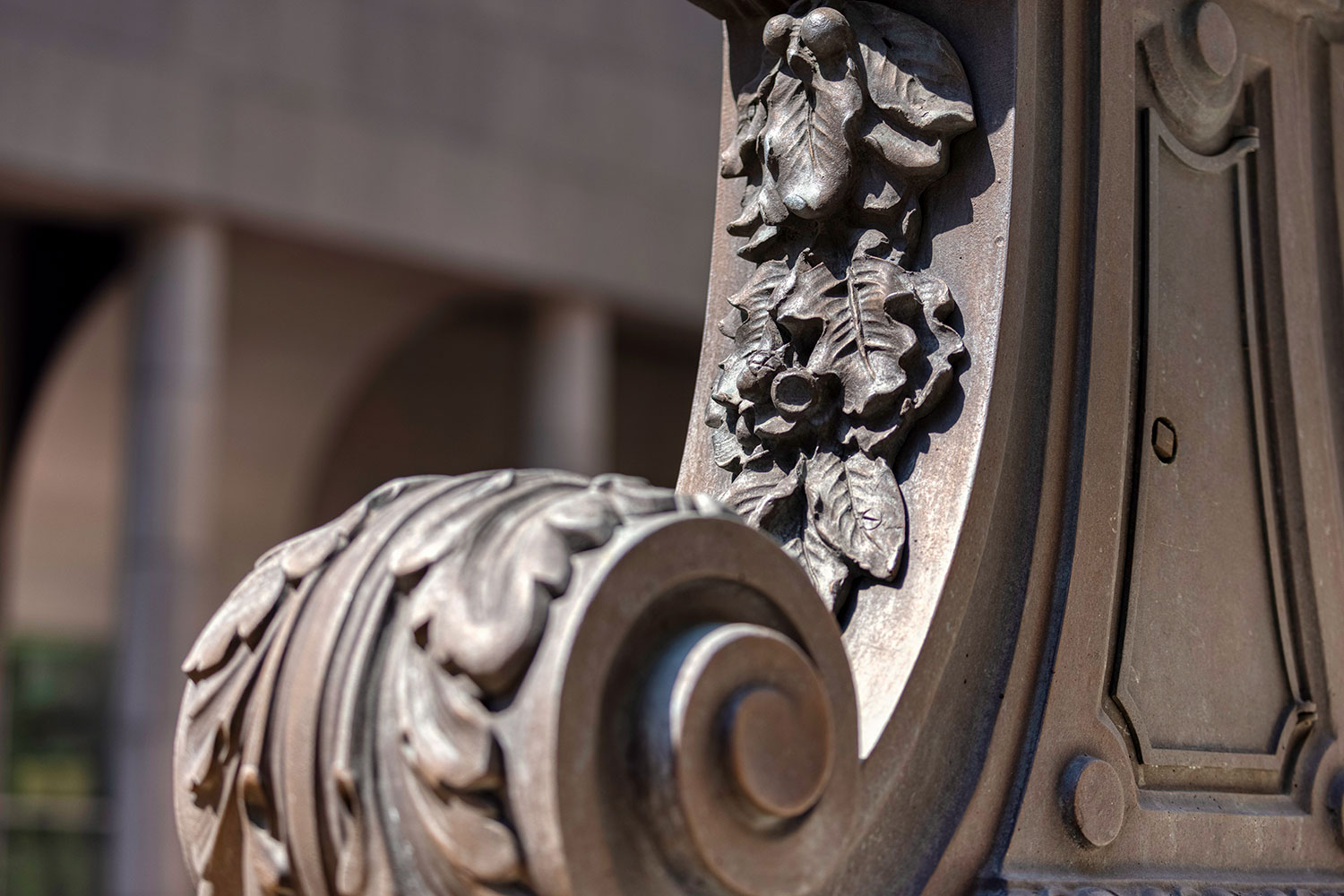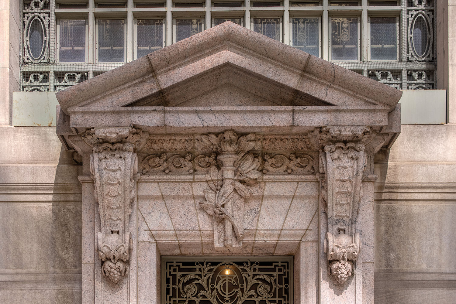 Below you’ll find a collection of my favorite images from that day, including glimpses of the new One Vanderbilt, and reflections of Grand Central across the now-closed Grand Hyatt, which won’t be visible for much longer. The photos also revive a long-talked-about point among mythology-lovers regarding Grand Central and who exactly appears upon the façade. Though architect Whitney Warren specifically identified the sculptural trio as Mercury, Hercules, and Minerva, the gear, hammer, and anvil symbols are more commonly associated with the Roman god Vulcan (or Hephaestus of Greek mythology). Hercules certainly seems like the more glamorous of the two, fitting in perfectly with the “Vanderbilt aesthetic,” yet Vulcan, god of metalwork, seems appropriate for a mighty railroad building links of iron and steel that connected the ever-growing United States. You’ll also find that another significant portion of the Vanderbilt aesthetic—the acorn and oak leaf motif—extends to the exterior of the station, including the streetlamps.