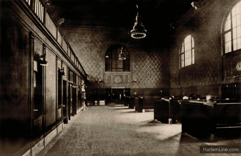 Befitting the ever growing city of White Plains, a new monumental station was planned to replace the old, and completed in 1914. Designed by two of Grand Central’s architects, Warren and Wetmore, the station was one of the most notable along the Harlem Line, and a twin to the station built at Poughkeepsie. It boasted a large waiting room (the largest in Westchester County) with six long, double-sided chestnut wood benches, a cafeteria where travelers could grab a meal, and an adjoining room for Railway Express. The new station was built on a pile foundation and featured a copper roof and exterior walls of patterned brick, adorned with terra cotta detailing. The inside was finished with brick and wood paneling, and used steam heating and as expected for a recently electrified railroad, electric lights. Similar to those found in Grand Central, chandeliers featured exposed bulbs, highlighting the use of electricity. Coupled with the large eastern-facing arched windows, the station was filled with light.