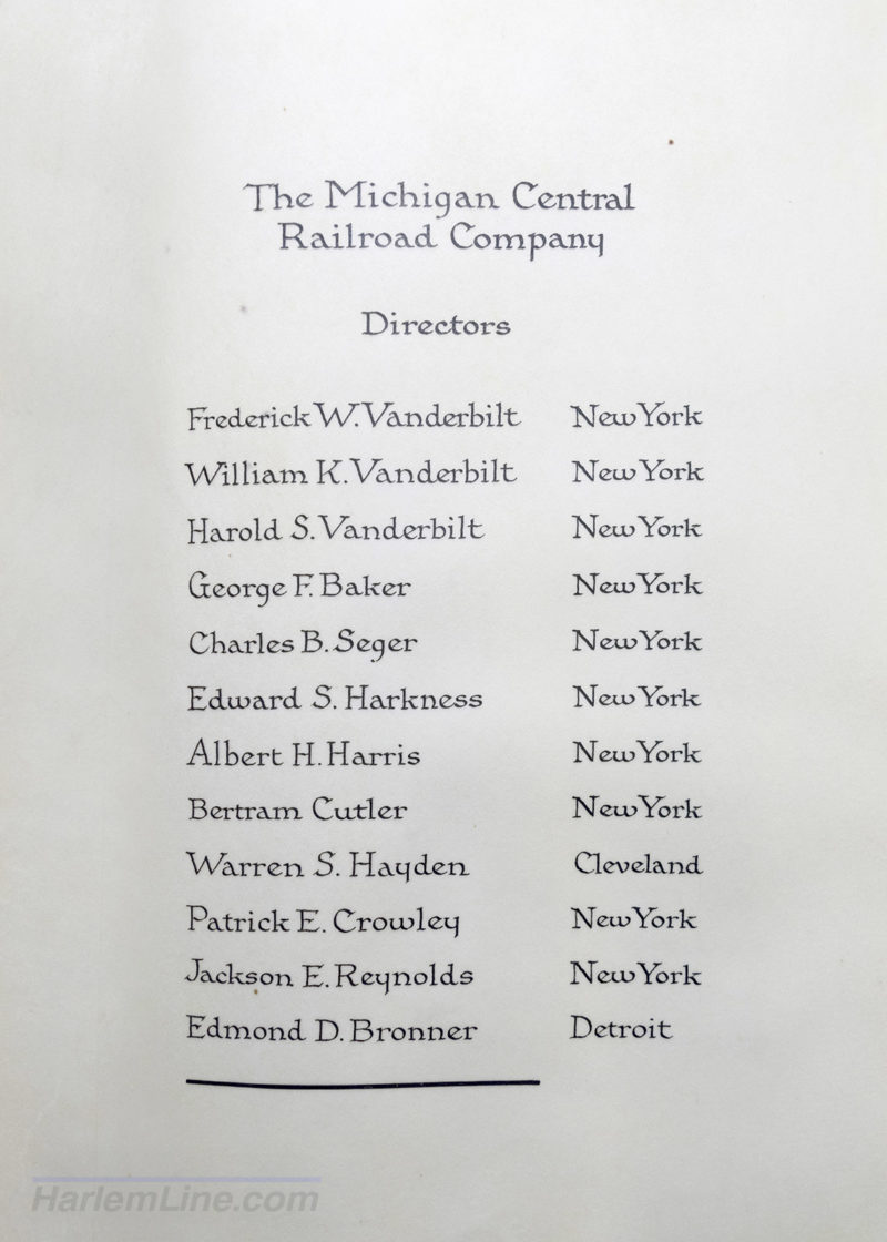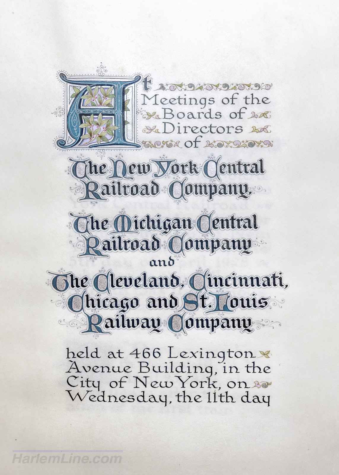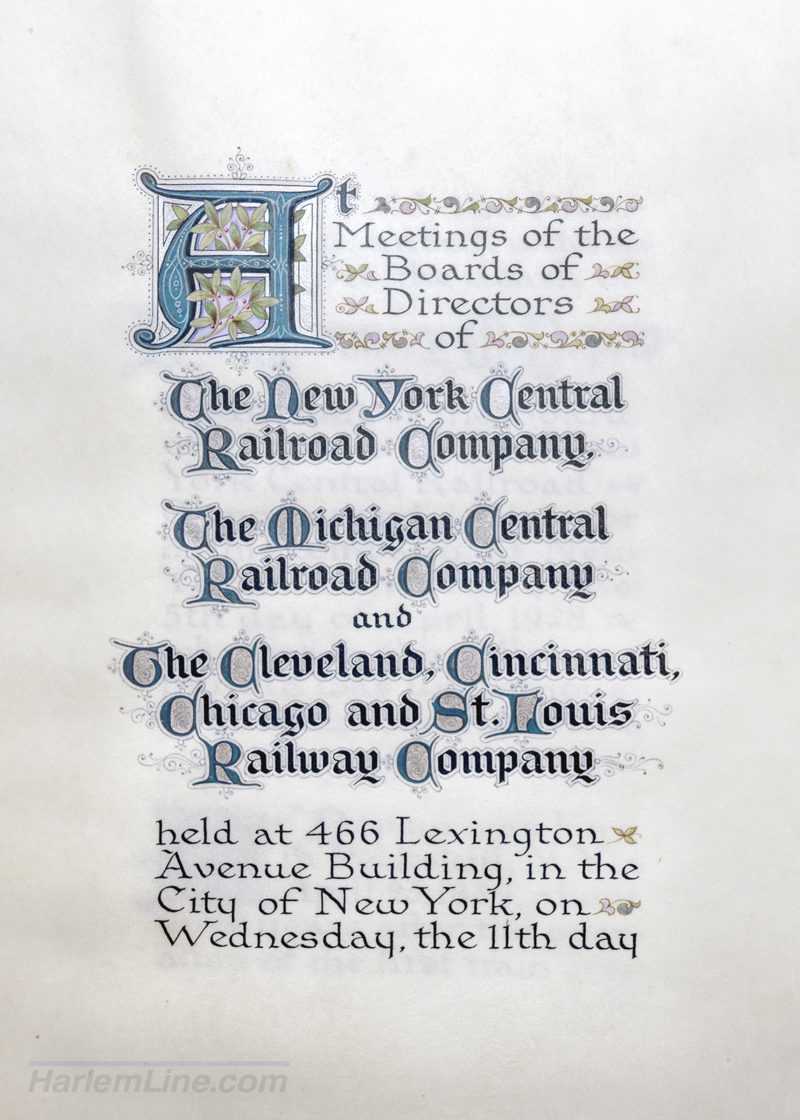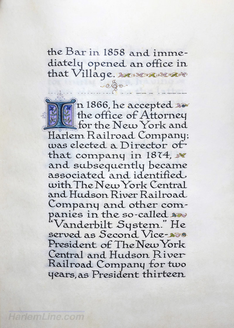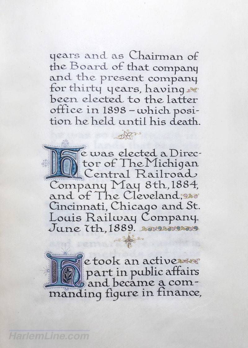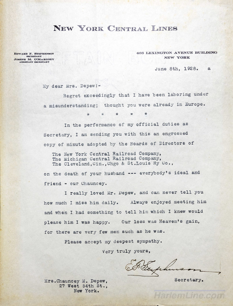 Ames & Rollinson created documents like these for a wide array of notable names, including Henry Morton Stanley, J. Pierpont Morgan, William Tecumseh Sherman, Walter P. Chrysler, George Pullman, and Chauncey Depew… whose original “death note” recently came into my possession. Commissioned by the New York Central Railroad Company, the Michigan Central Railroad Company, and the Cleveland, Cincinnati, Chicago, and St. Louis Railway Company, the ten page document provides a brief biography of Depew, along with a heartfelt tribute, and a listing of all of the board members for each of the railroad companies. Along with the folder is the original letter written by railroad secretary Edward Stephenson to Depew’s widow May Eugenie Palmer when the book was mailed to her.