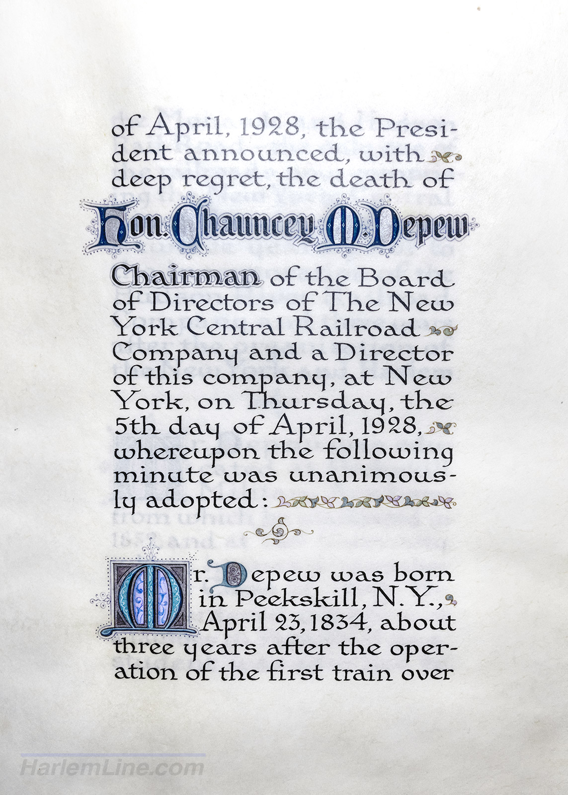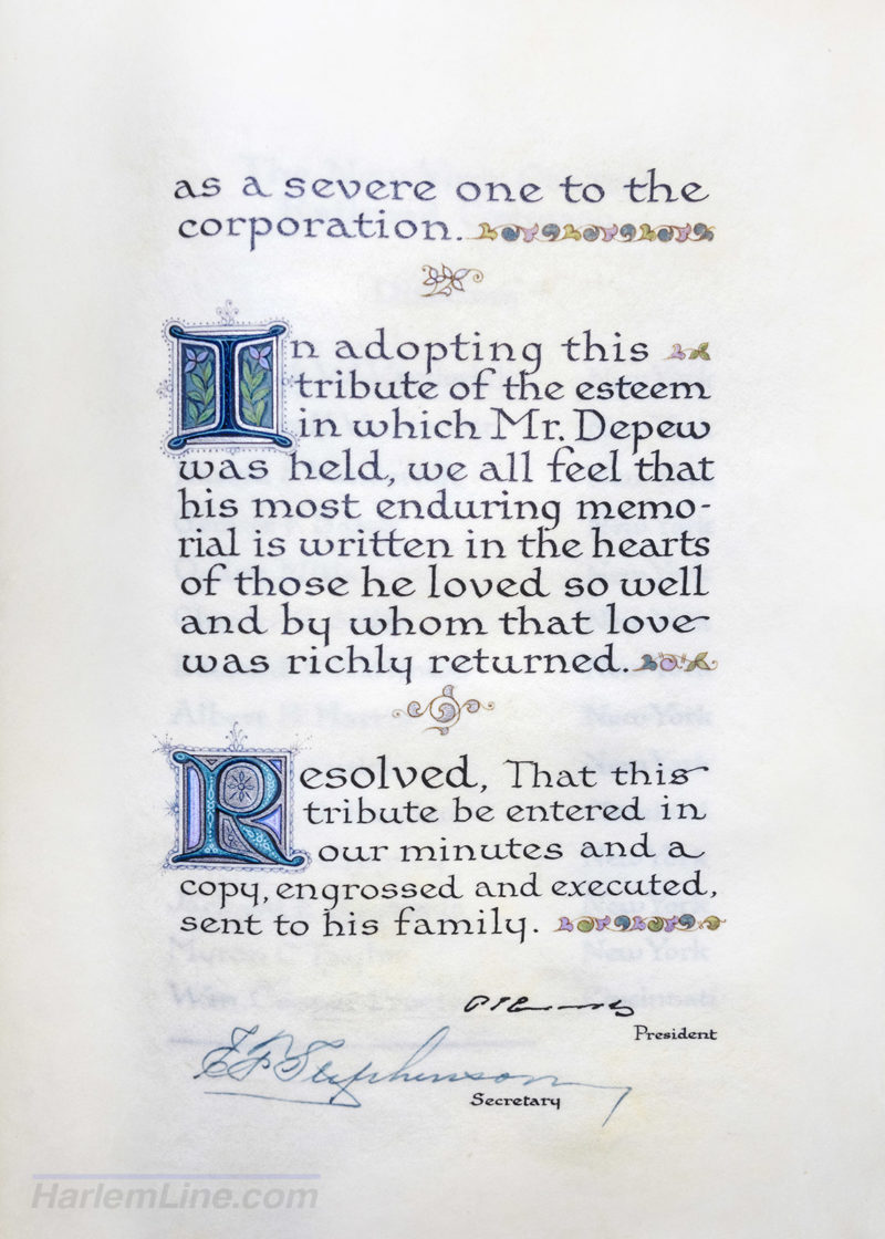 Emily, Thank you for posting. . First, I have studied calligraphy and appreciate the beauty of this art. Second, I am researching Depew and this document shows the high esteem he was held.