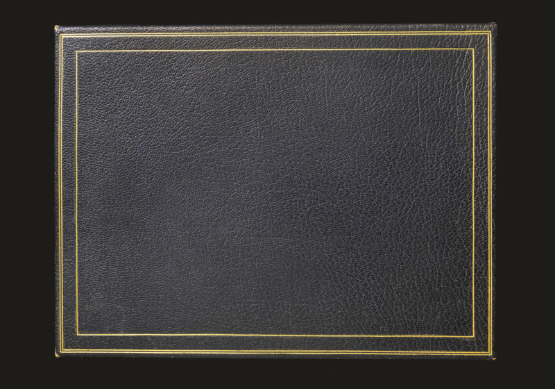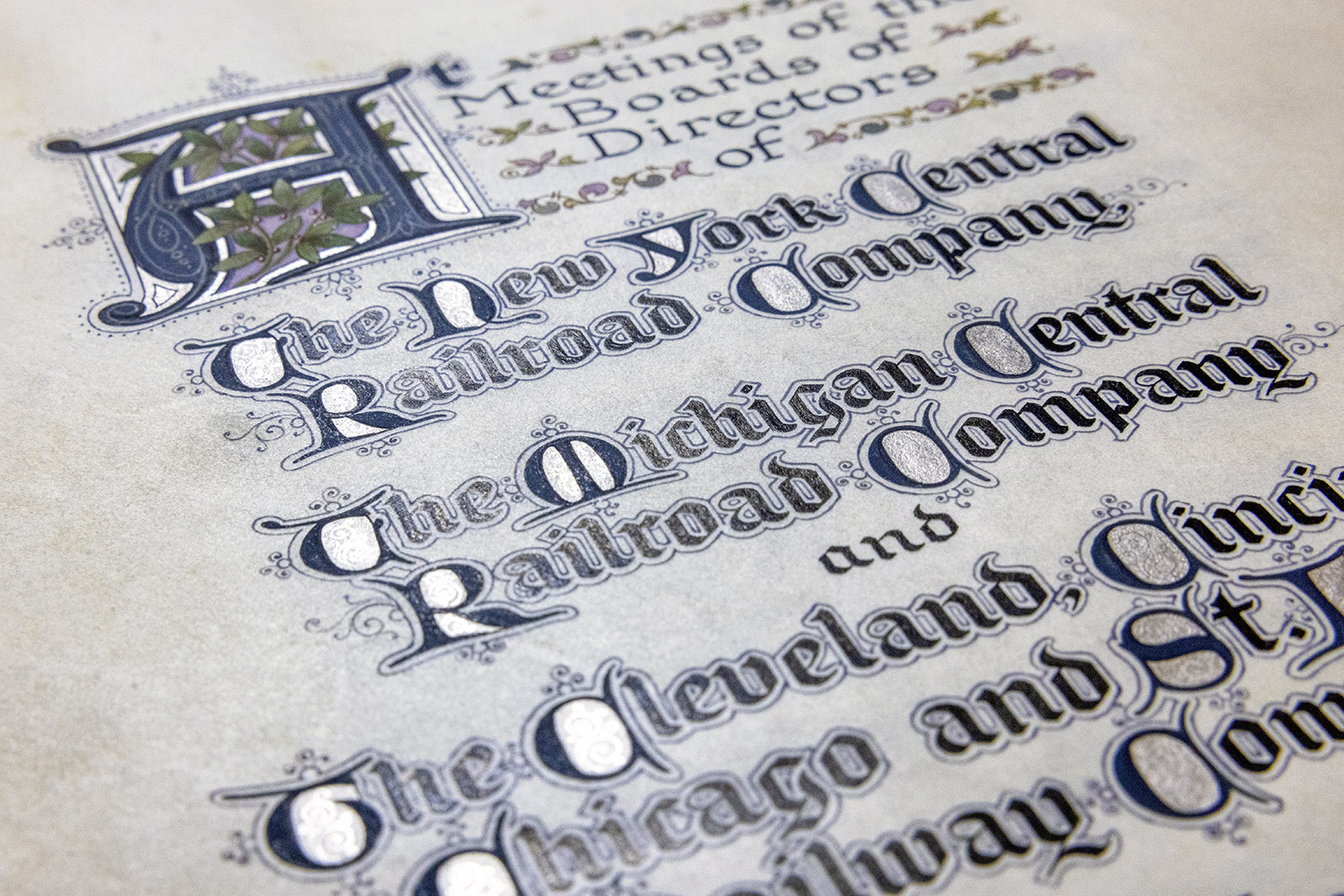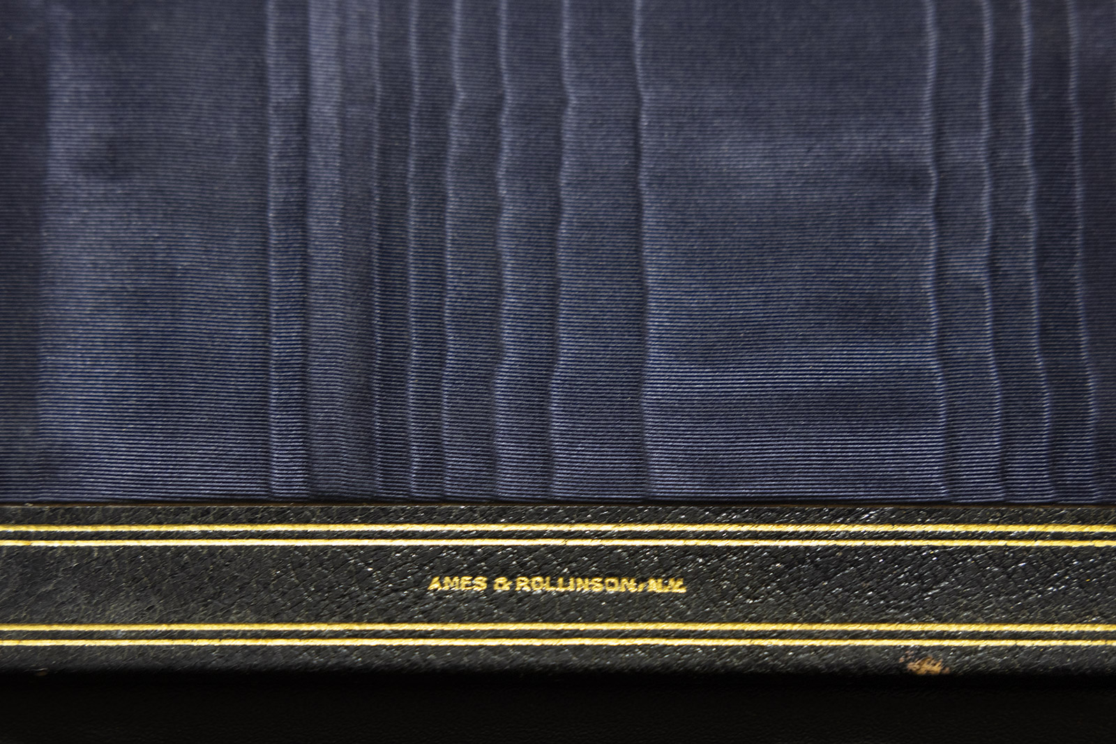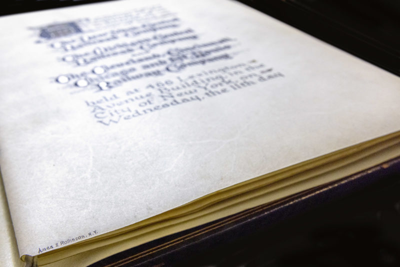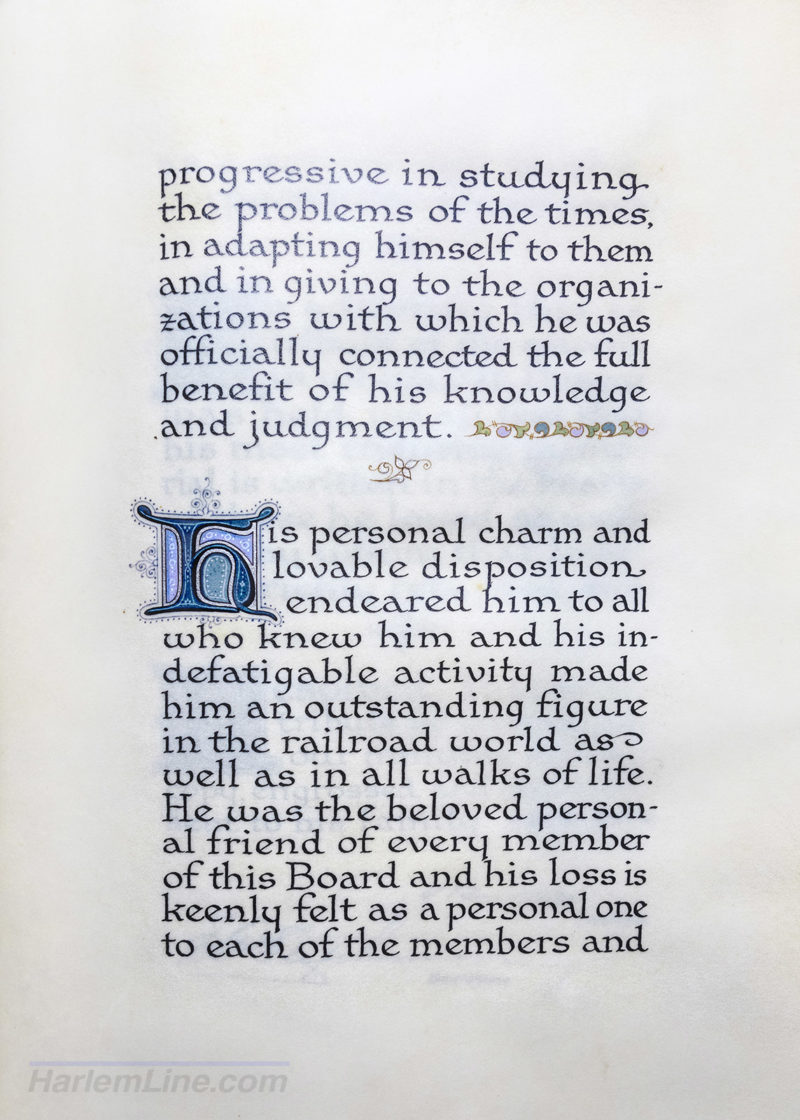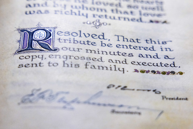 In lieu of any established name for said documents, I began referring to them in my mind as “death notes.” Typically, when an executive, president, or board member of a prominent company passed away, the board of said company recognized their efforts and achievements in the minutes of their next meeting. The transcript for that portion of the meeting was then sent to the artisans over at Ames & Rollinson, who produced an illuminated and bound copy to be presented to the next of kin. No expense was spared for these commemorative folders—they were bound in the traditional Moroccan style with a gilt tooled and dyed goatskin cover, a watered silk doublure, sheep or calfskin pages, and illuminated with either Italian gold or French platinum leaf. The resulting book would then be signed by a representative of the company before being sent off to usually the deceased executive’s wife.