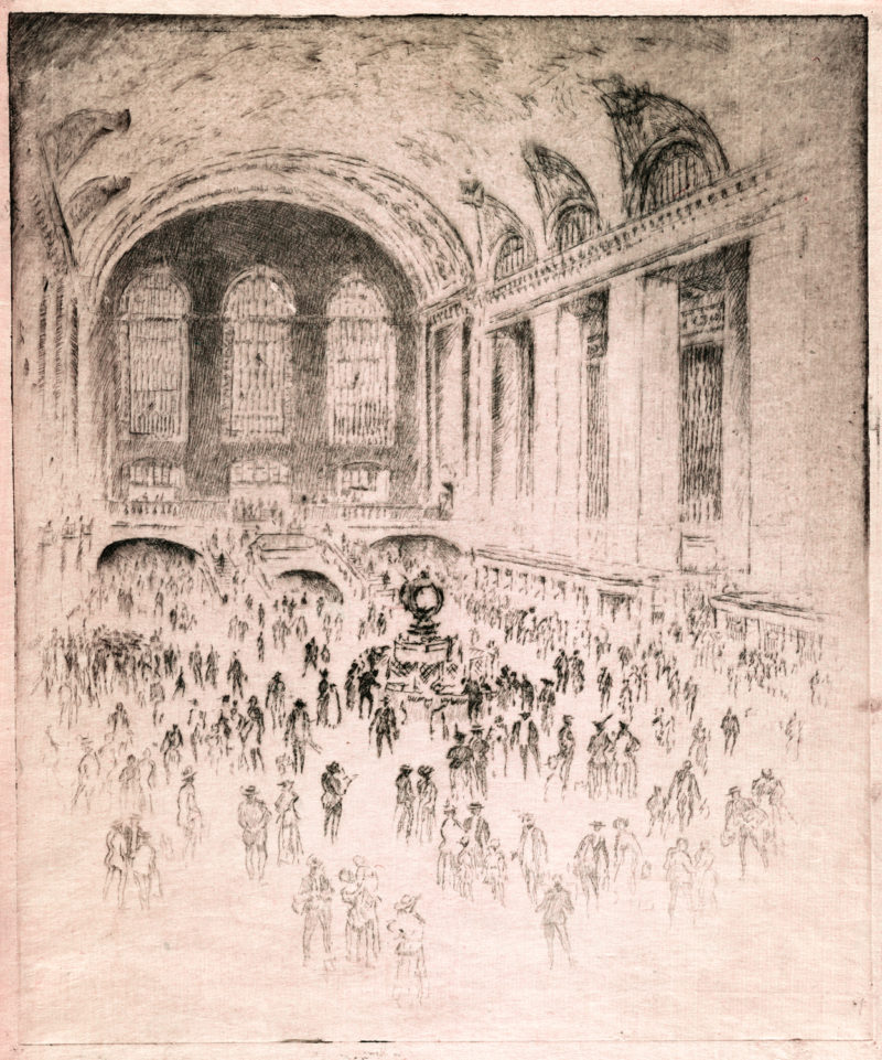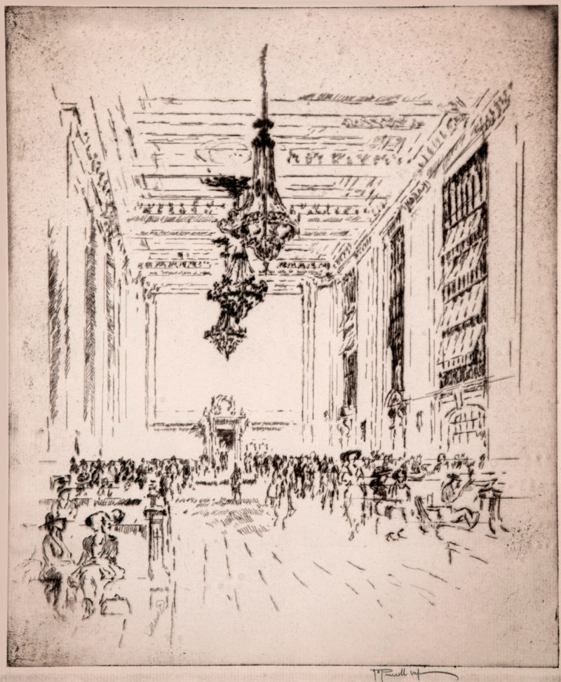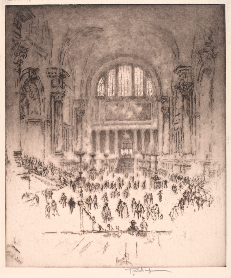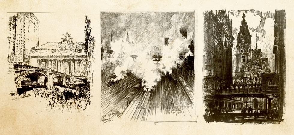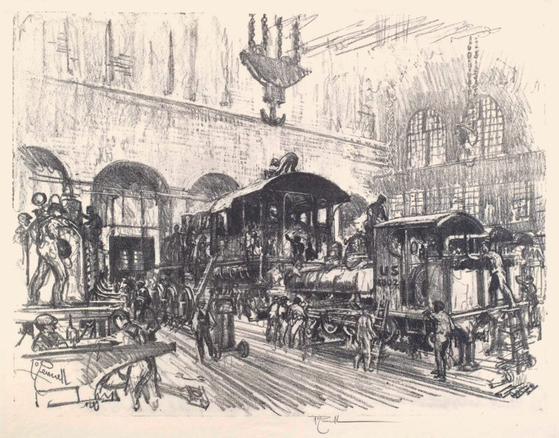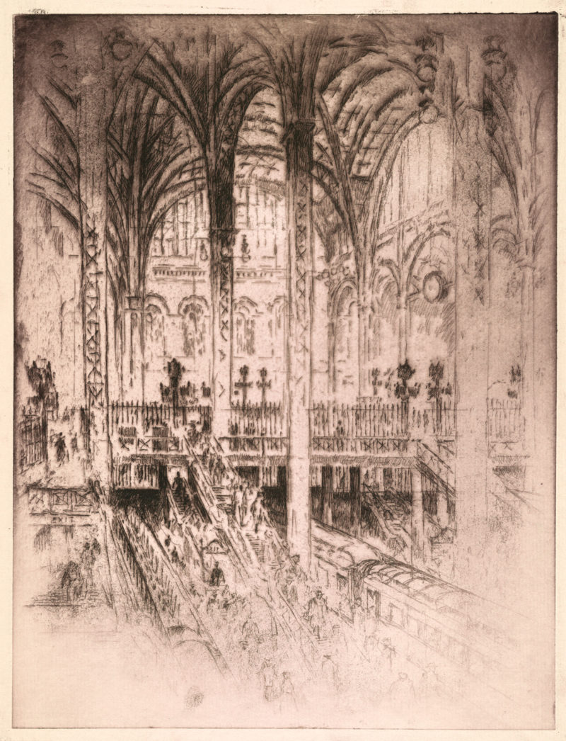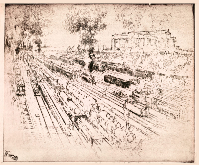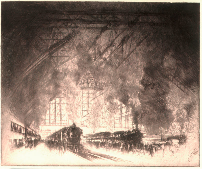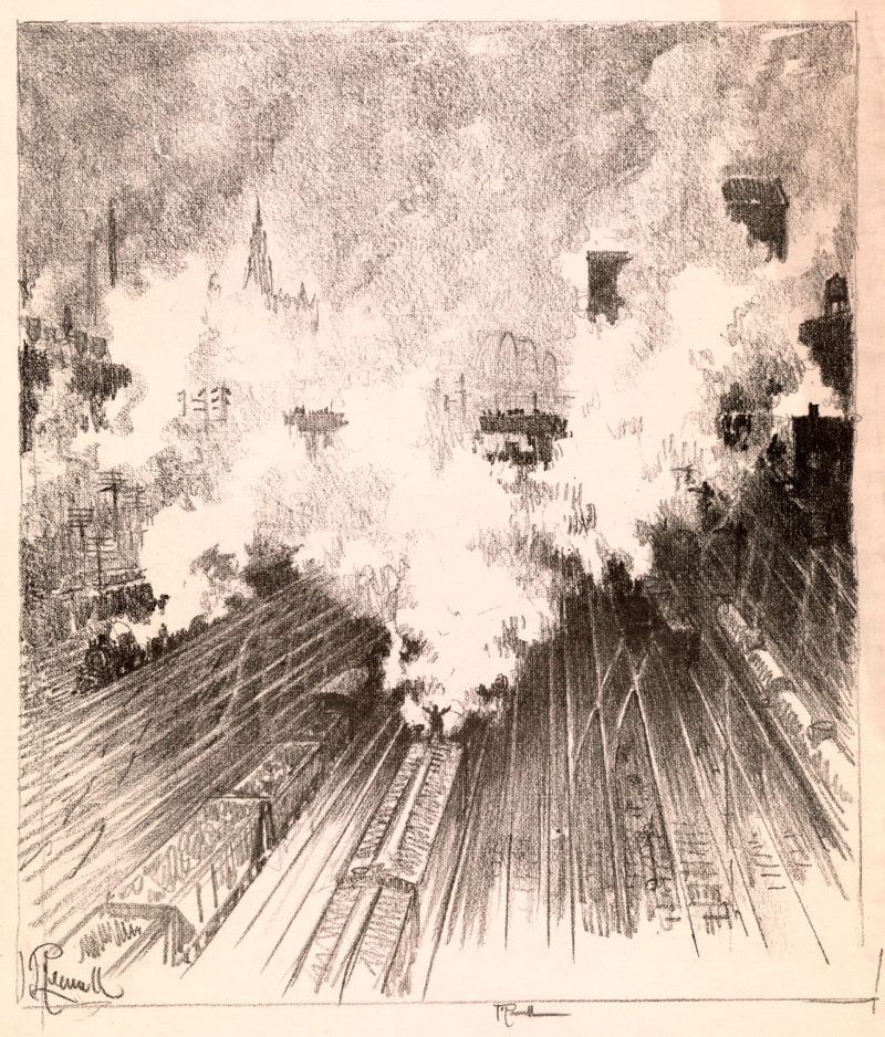 Enter Joseph Pennell. More than just skilled in the arts of printmaking, he was a master of the craft. Although his work illustrating articles for Harper’s and The Century Magazine took him around the world, his prints of railroading subjects in Pennsylvania (his home) and New York (the city that inspired him and eventually became his home) are especially memorable. Working mainly in the techniques of intaglio, aquatint, and lithography, his body of work captures notable moments in American railroading history—from the construction of New York’s Pennsylvania Station and Hell Gate Bridge, to lovely views of Grand Central Terminal, and Philadelphia’s long-gone Broad Street Station.