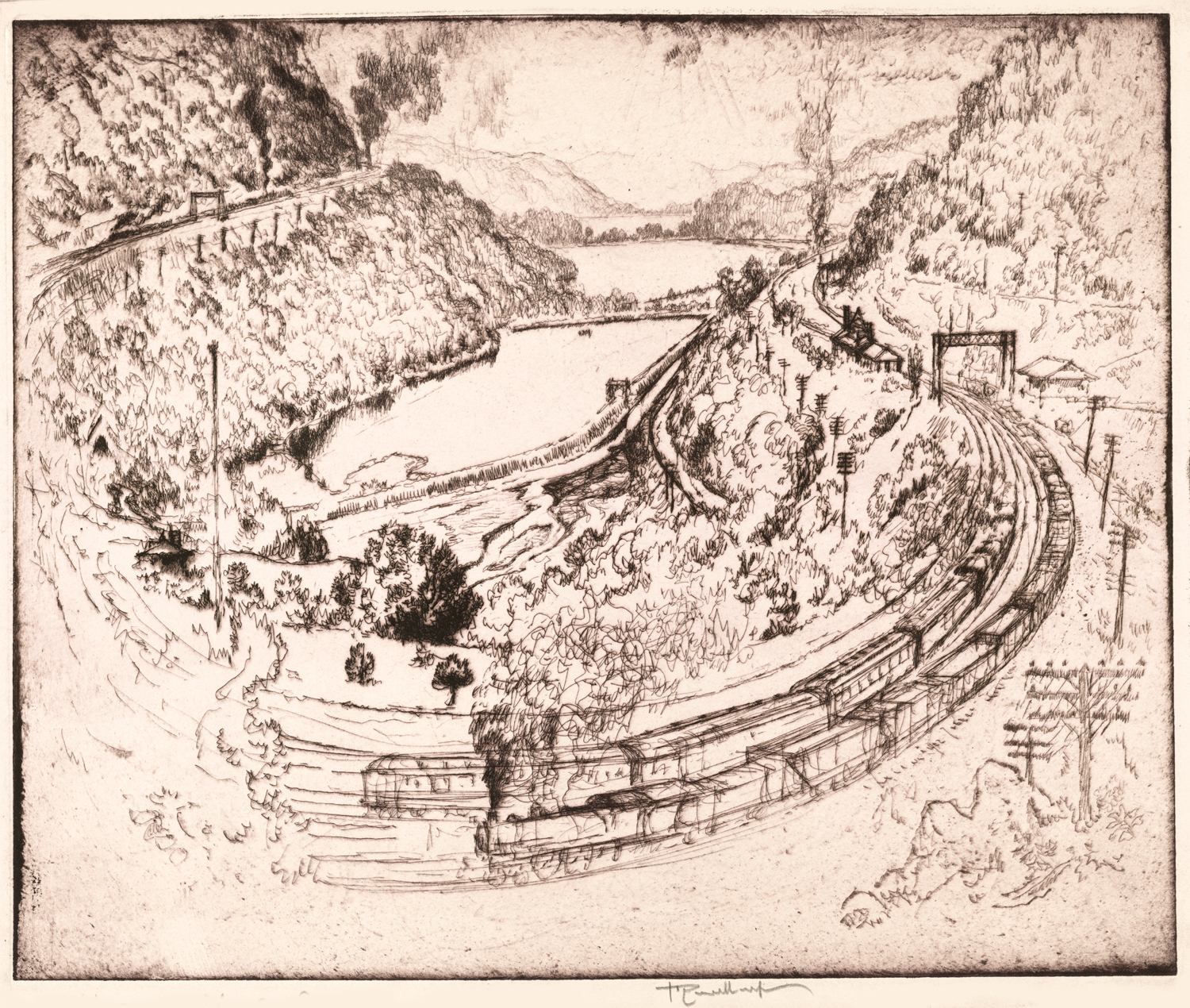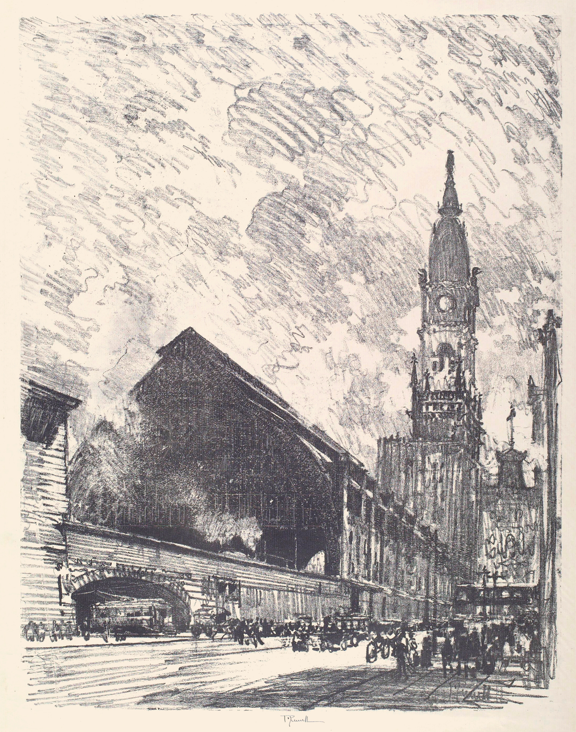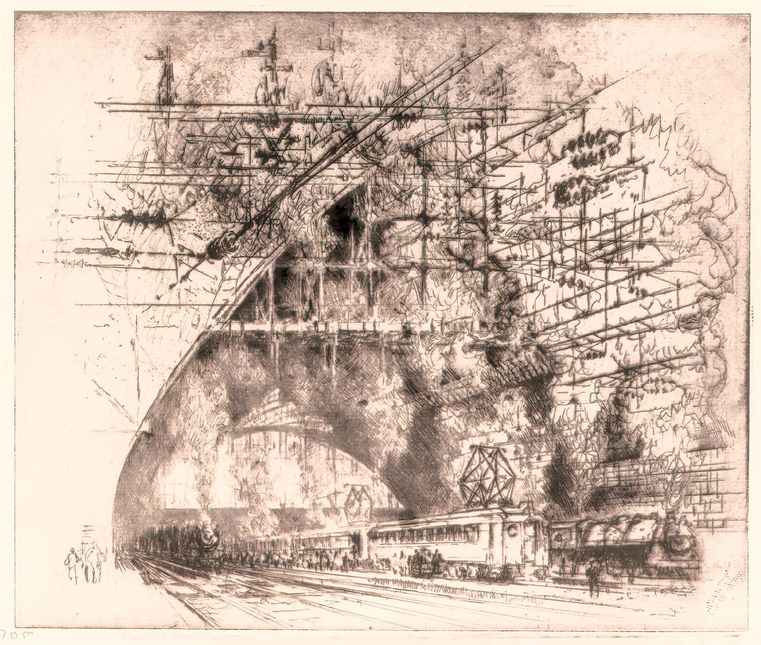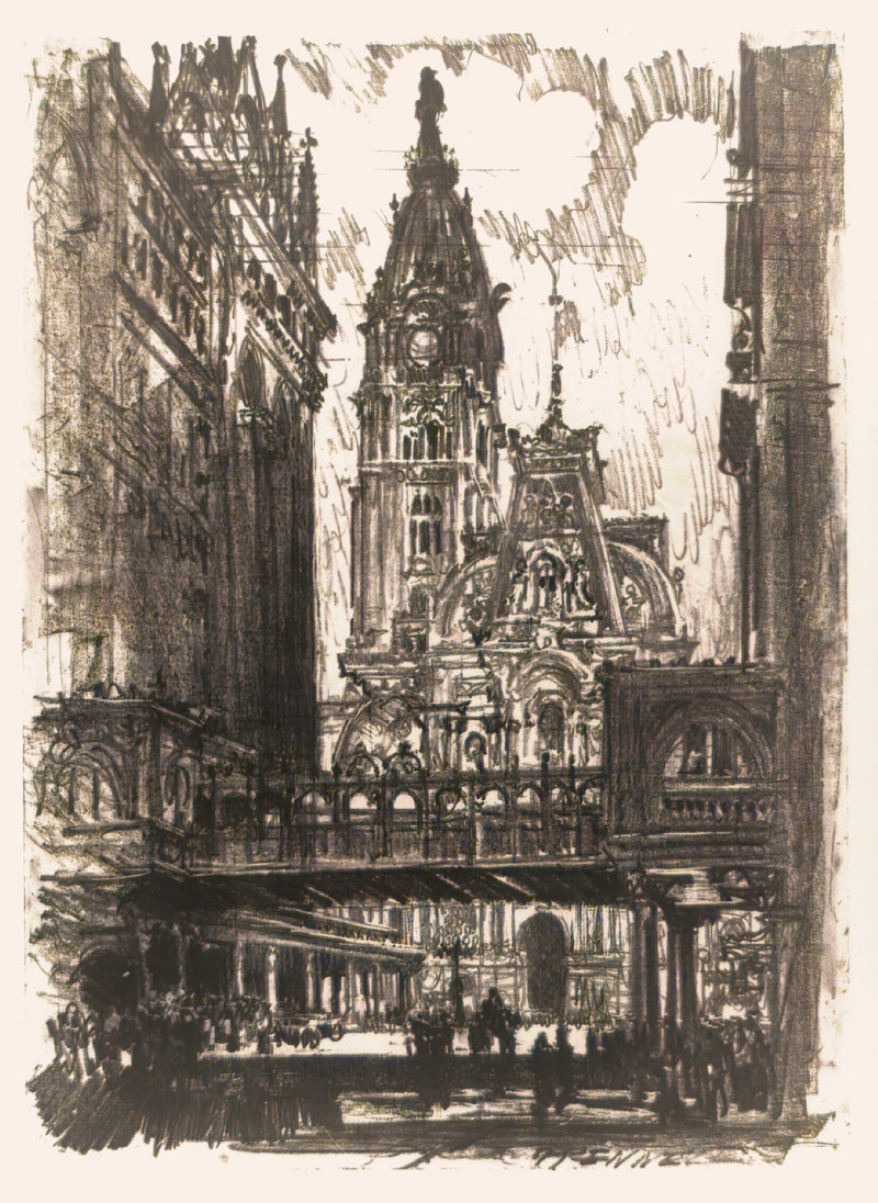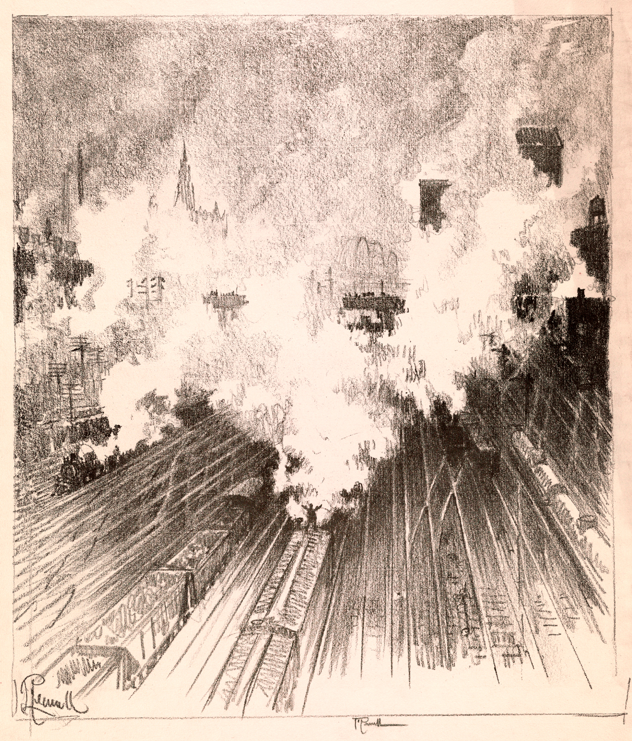Enter Joseph Pennell. More than just skilled in the arts of printmaking, he was a master of the craft. Although his work illustrating articles for Harper’s and The Century Magazine took him around the world, his prints of railroading subjects in Pennsylvania (his home) and New York (the city that inspired him and eventually became his home) are especially memorable. Working mainly in the techniques of intaglio, aquatint, and lithography, his body of work captures notable moments in American railroading history—from the construction of New York’s Pennsylvania Station and Hell Gate Bridge, to lovely views of Grand Central Terminal, and Philadelphia’s long-gone Broad Street Station.