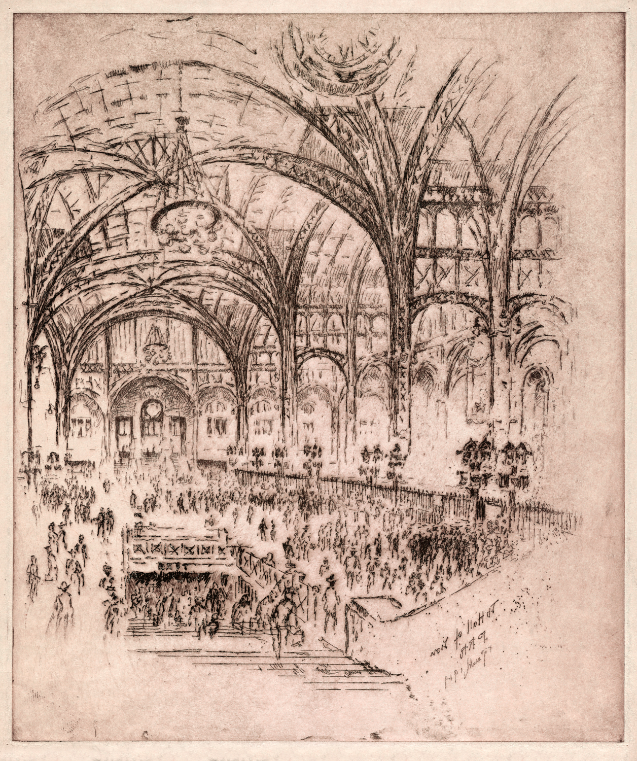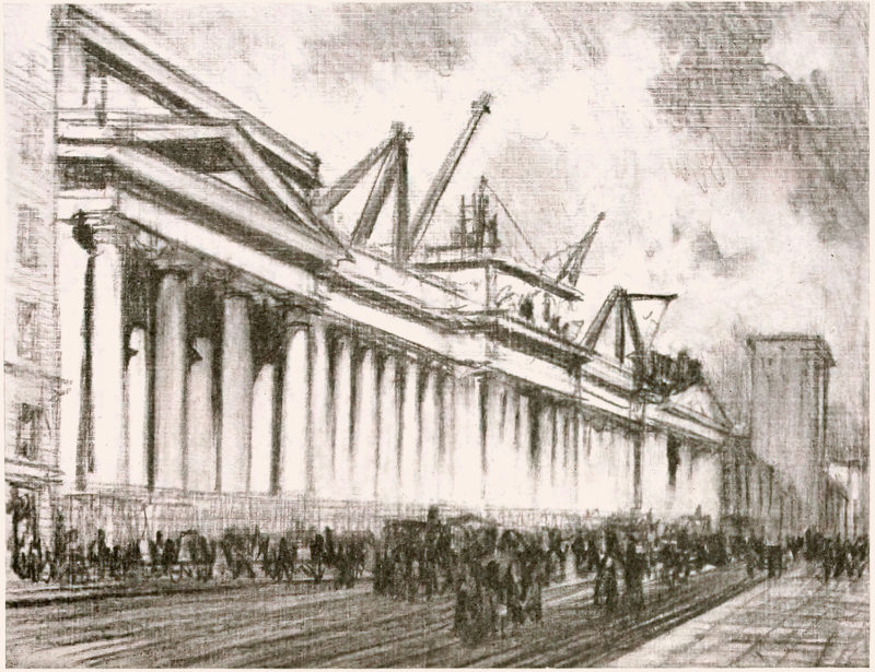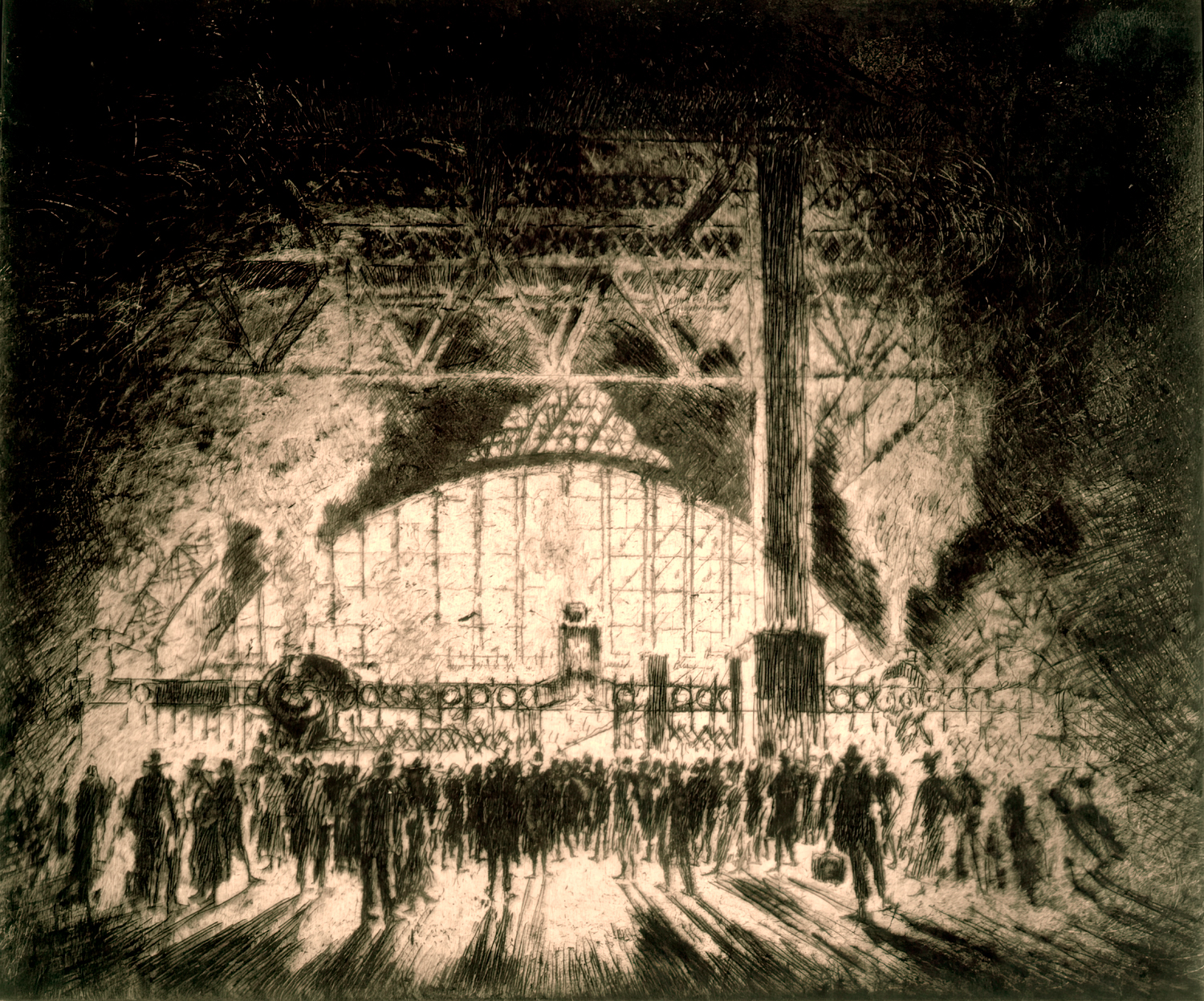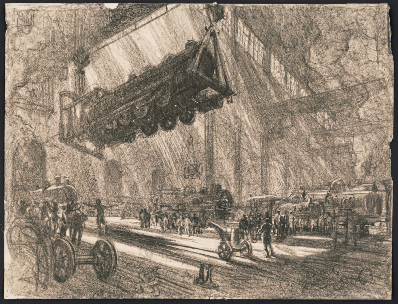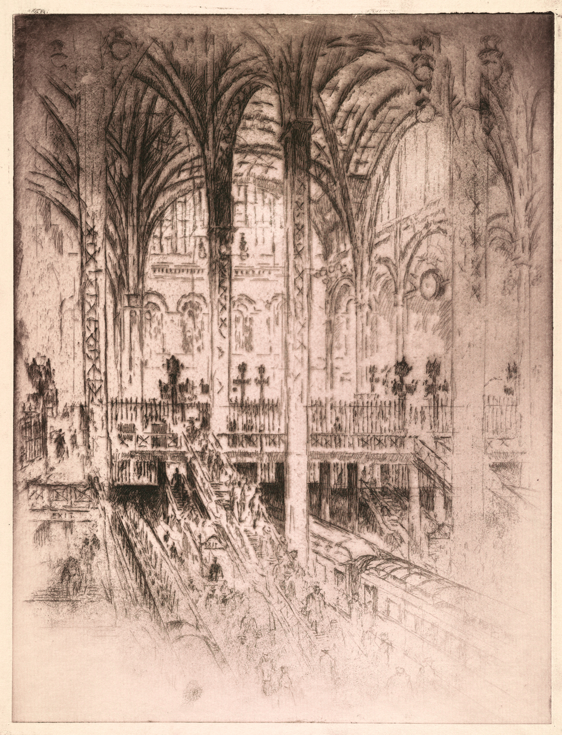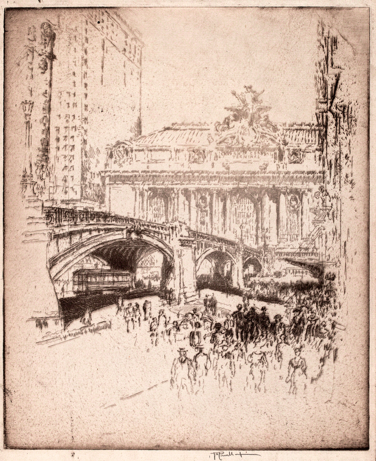 Enter Joseph Pennell. More than just skilled in the arts of printmaking, he was a master of the craft. Although his work illustrating articles for Harper’s and The Century Magazine took him around the world, his prints of railroading subjects in Pennsylvania (his home) and New York (the city that inspired him and eventually became his home) are especially memorable. Working mainly in the techniques of intaglio, aquatint, and lithography, his body of work captures notable moments in American railroading history—from the construction of New York’s Pennsylvania Station and Hell Gate Bridge, to lovely views of Grand Central Terminal, and Philadelphia’s long-gone Broad Street Station.