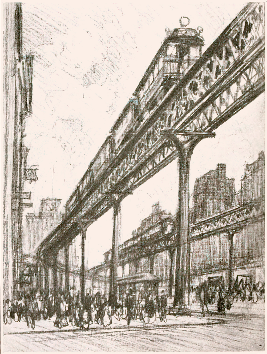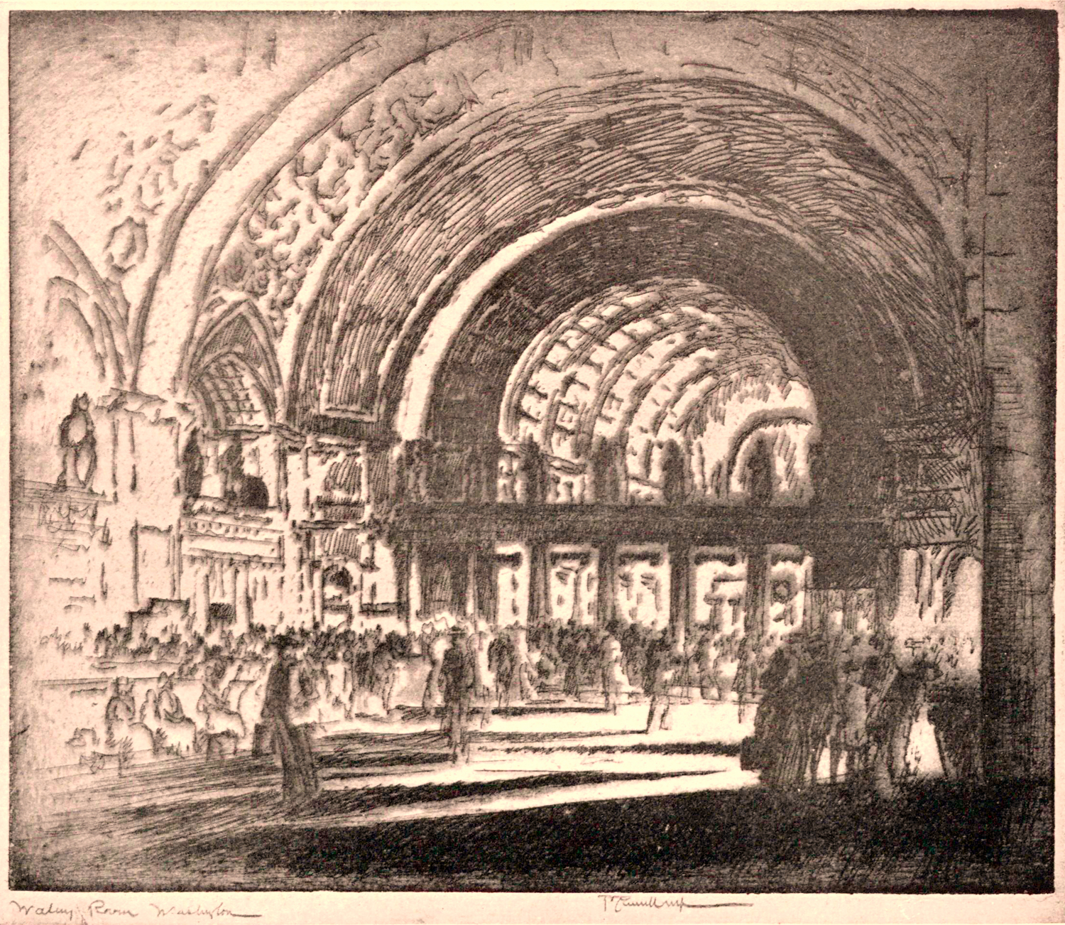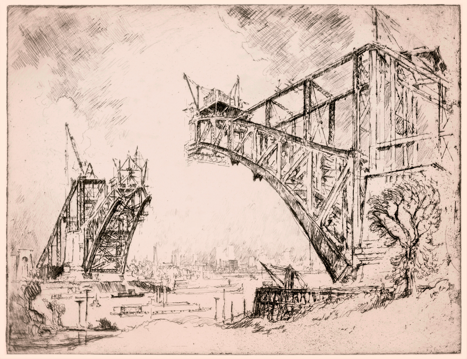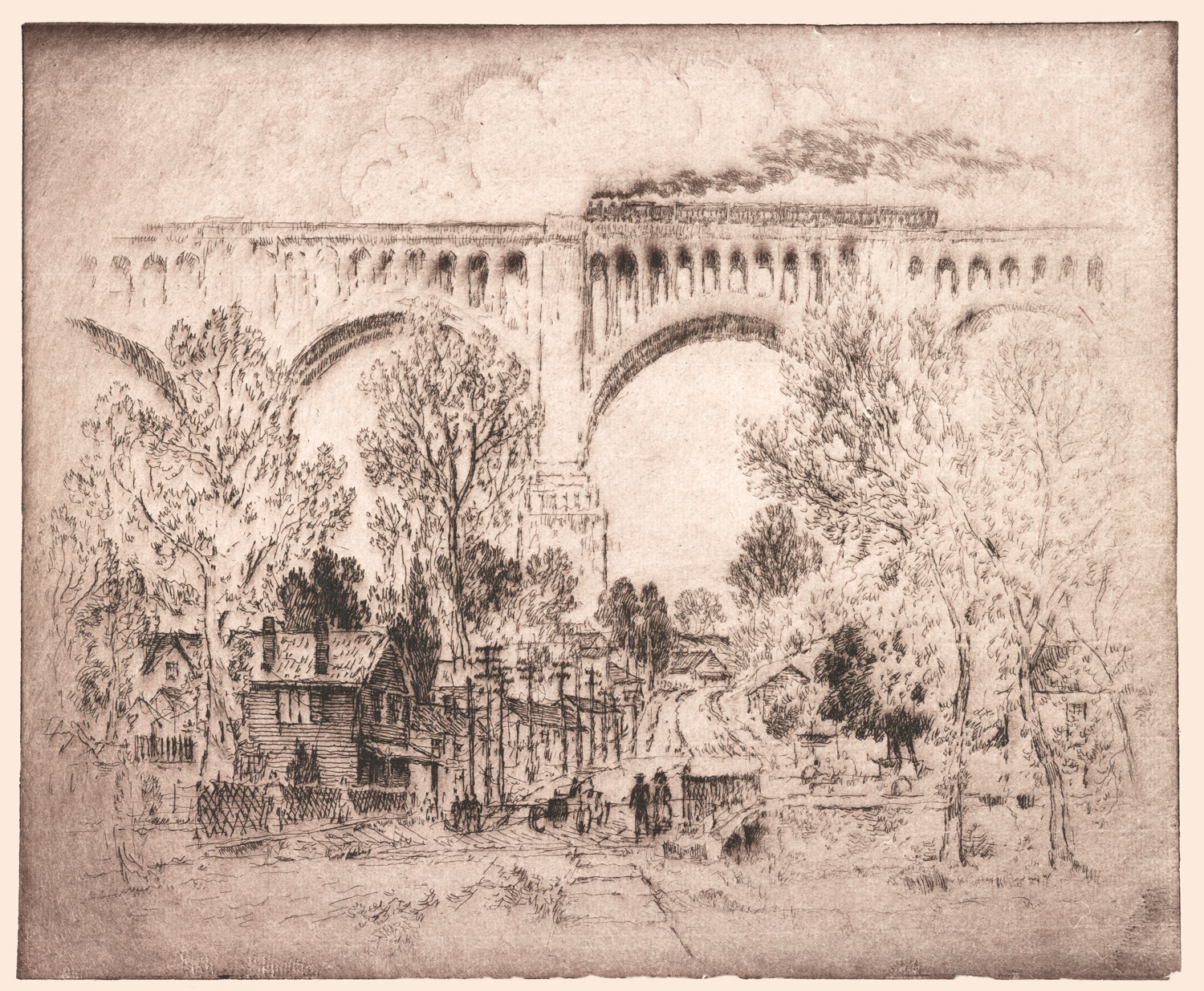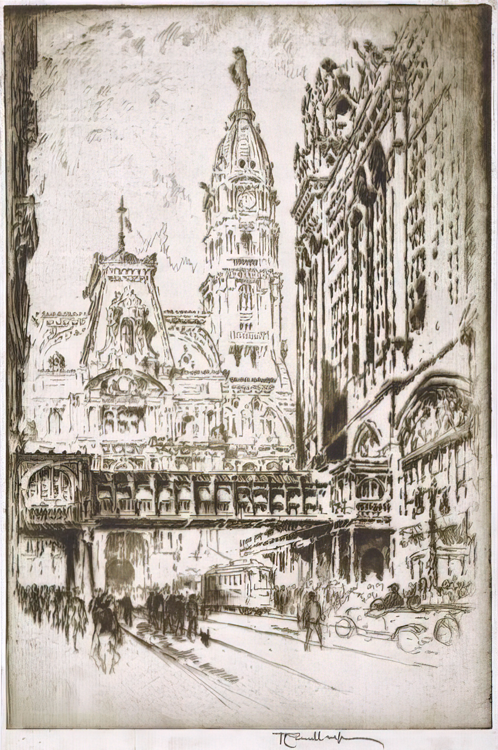 Enter Joseph Pennell. More than just skilled in the arts of printmaking, he was a master of the craft. Although his work illustrating articles for Harper’s and The Century Magazine took him around the world, his prints of railroading subjects in Pennsylvania (his home) and New York (the city that inspired him and eventually became his home) are especially memorable. Working mainly in the techniques of intaglio, aquatint, and lithography, his body of work captures notable moments in American railroading history—from the construction of New York’s Pennsylvania Station and Hell Gate Bridge, to lovely views of Grand Central Terminal, and Philadelphia’s long-gone Broad Street Station.